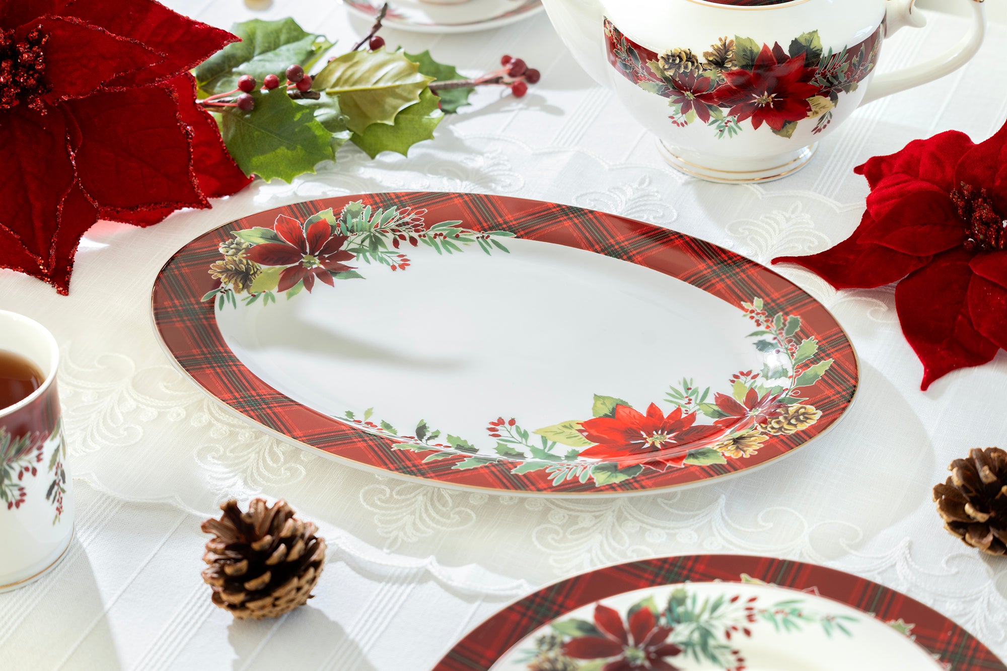 14" Poinsettia Pine Cone Fine Porcelain Oval Serving Platter