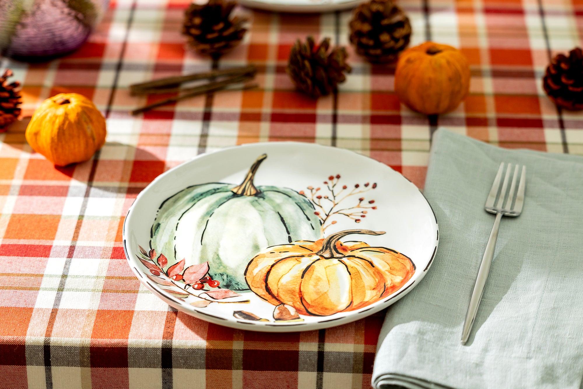 These plates stand out with their subtle textured detailing, designed to mimic the natural ridges of pumpkins, adding a tactile element that enriches the overall design.