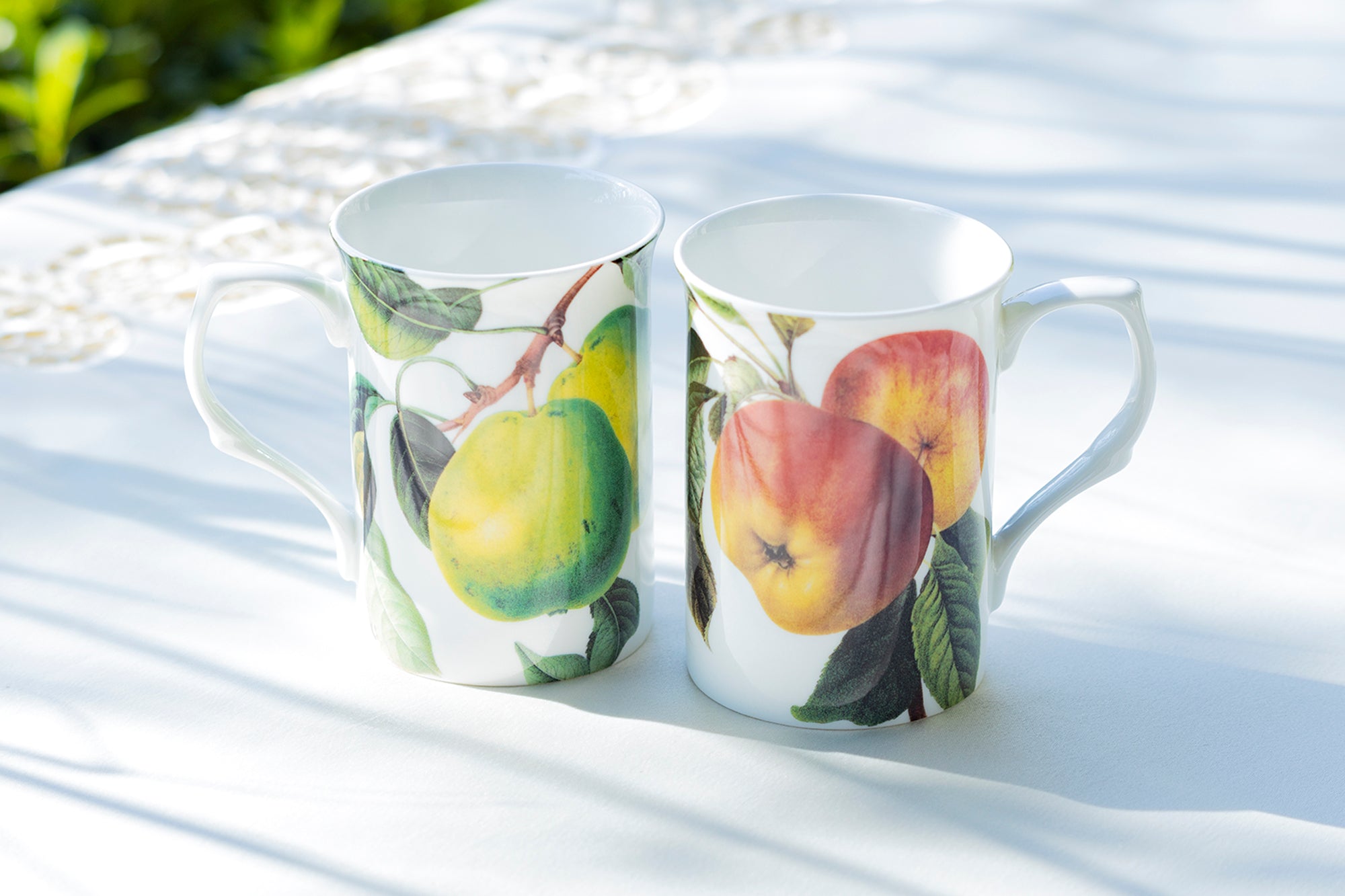 Each set includes - 2 bone china mugs (1 apple mug & 1 pear mug)
