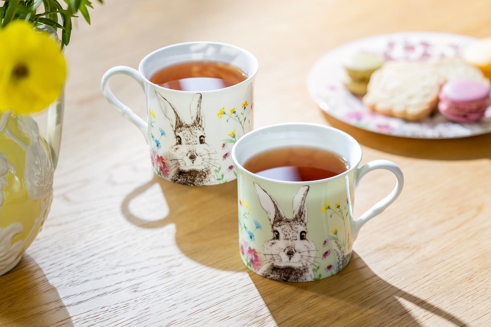 Each set includes - 2 assorted flower bunny mugs (green x1 and white x1)