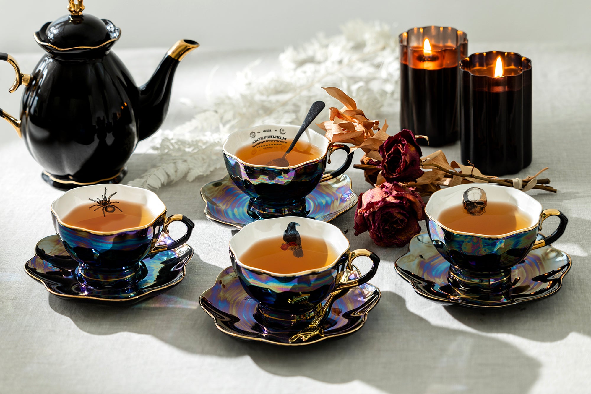 Each set includes - 4 Assorted Halloween Black Gold Luster Tea Cup and Saucer Sets(Crow, Spider, Skull, Ouija Board - one of each)