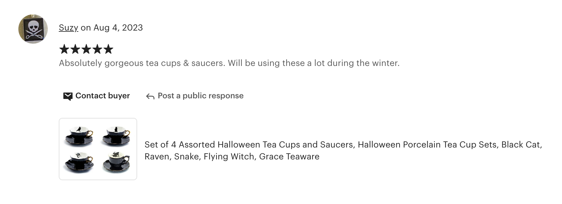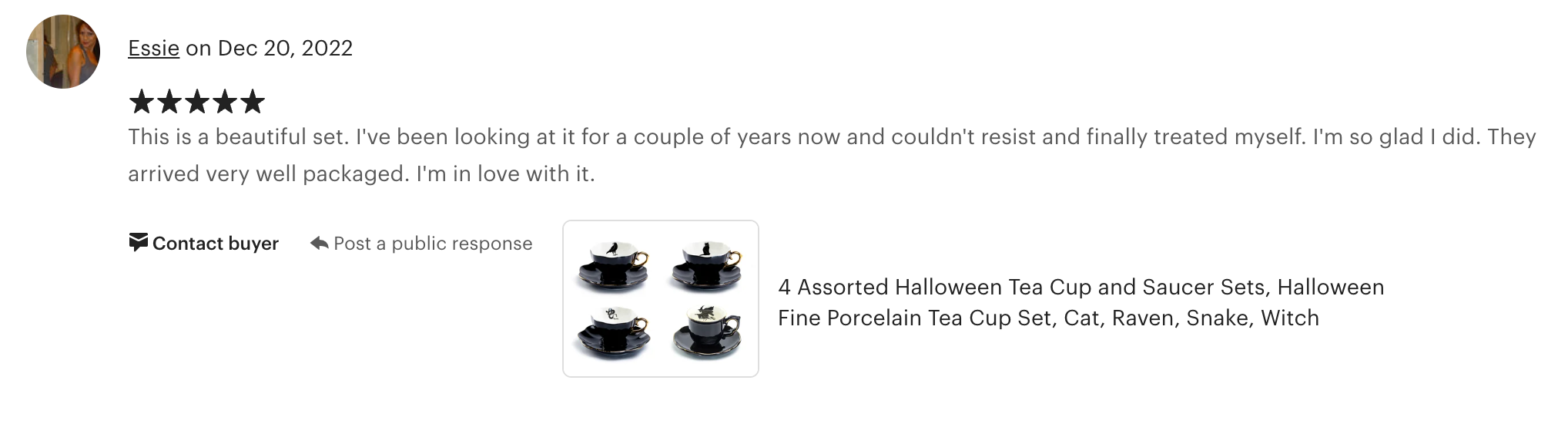 This set includes - 4 Assorted Halloween Tea Cup and Saucer Sets (Cat, Raven, Snake, Flying Witch - one of each)
