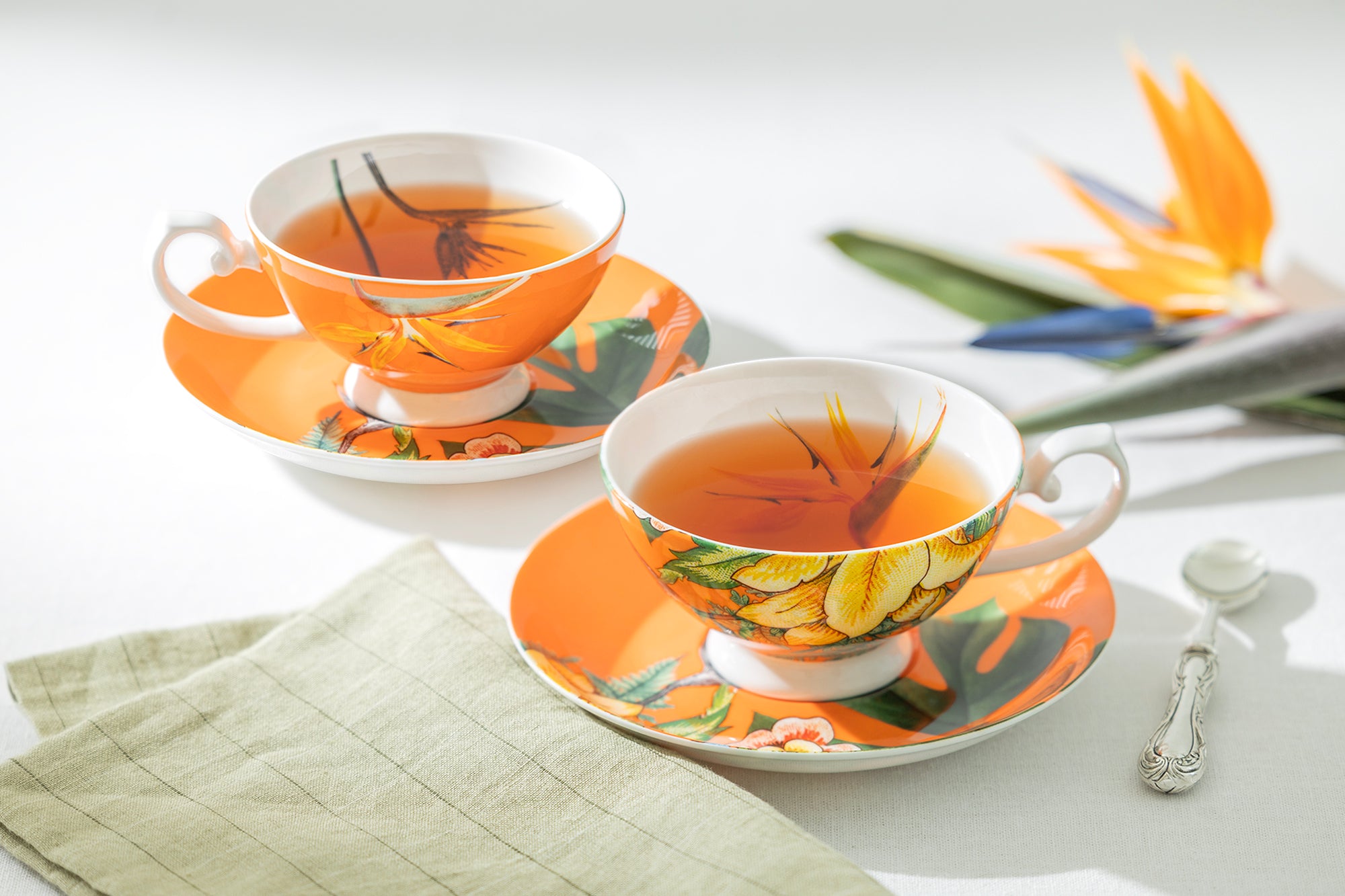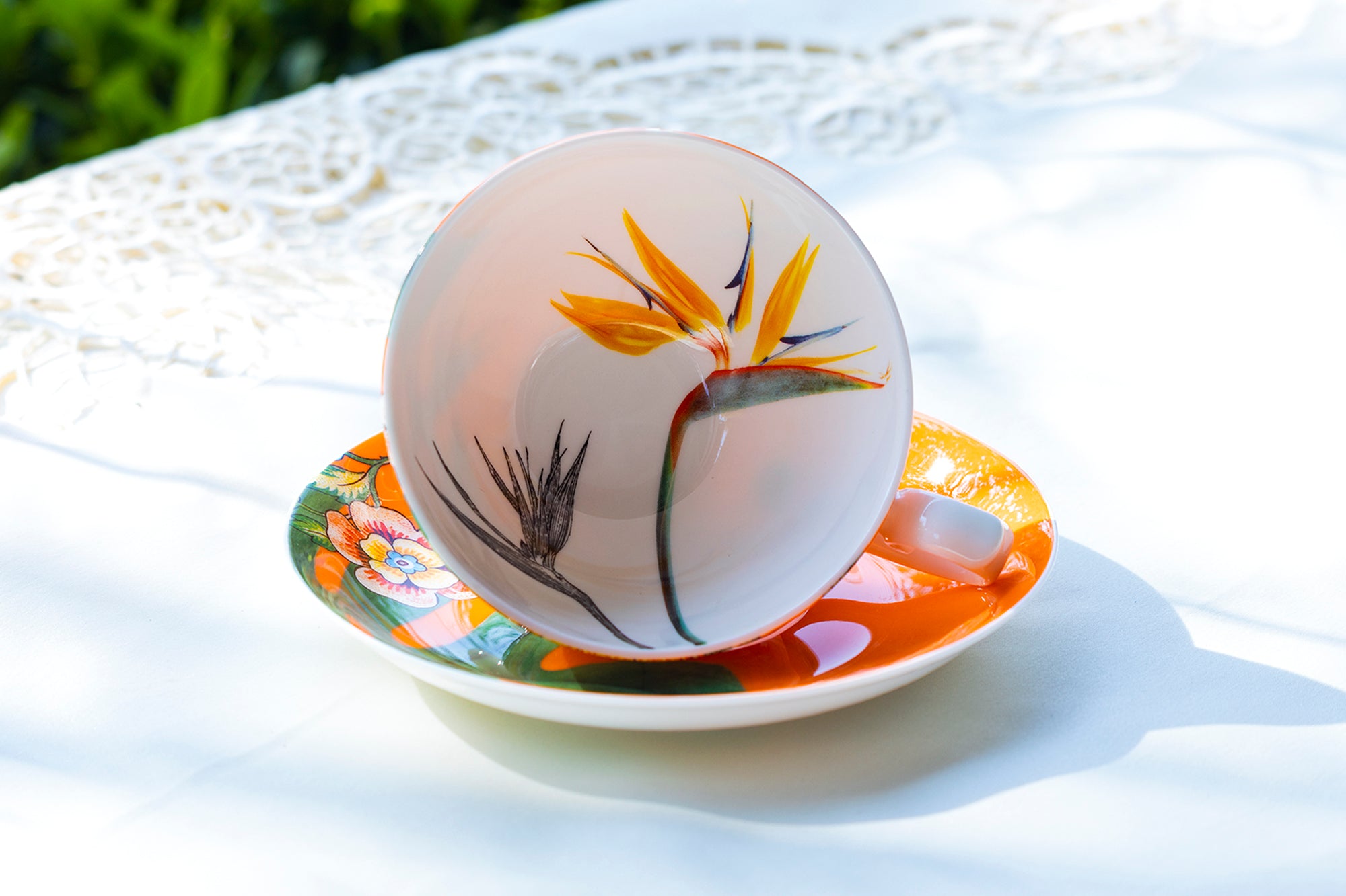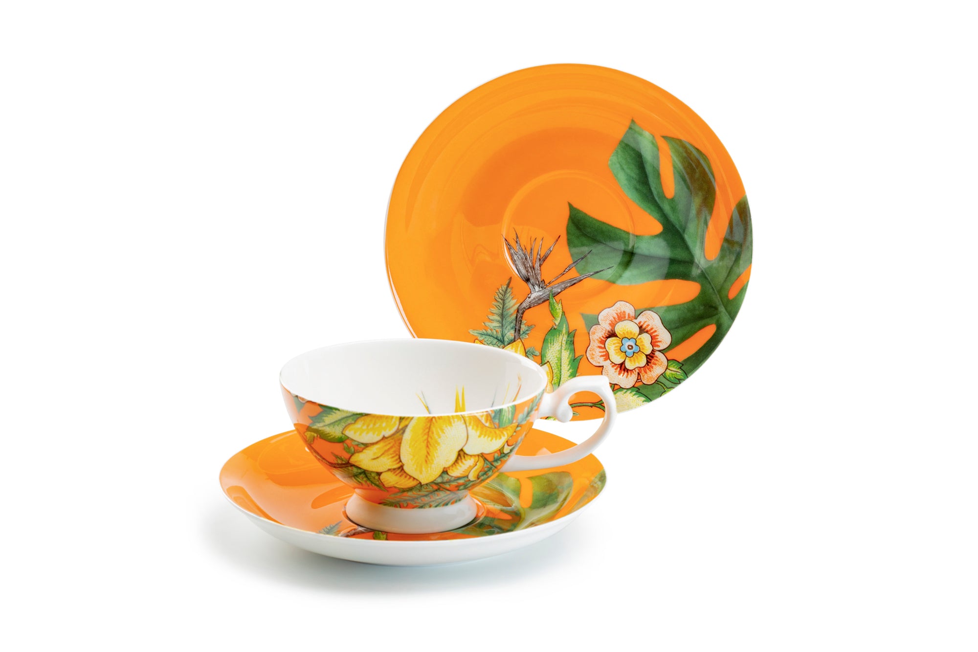 • Bird of Paradise and Monstera Leaf Bone China Tea Cup and Saucer