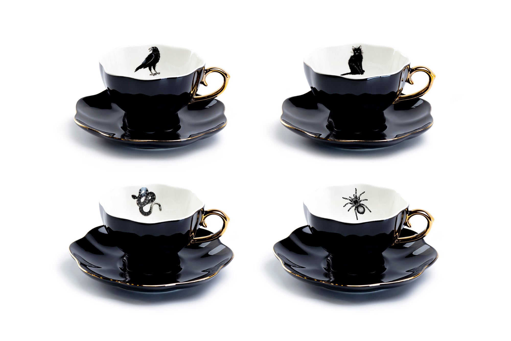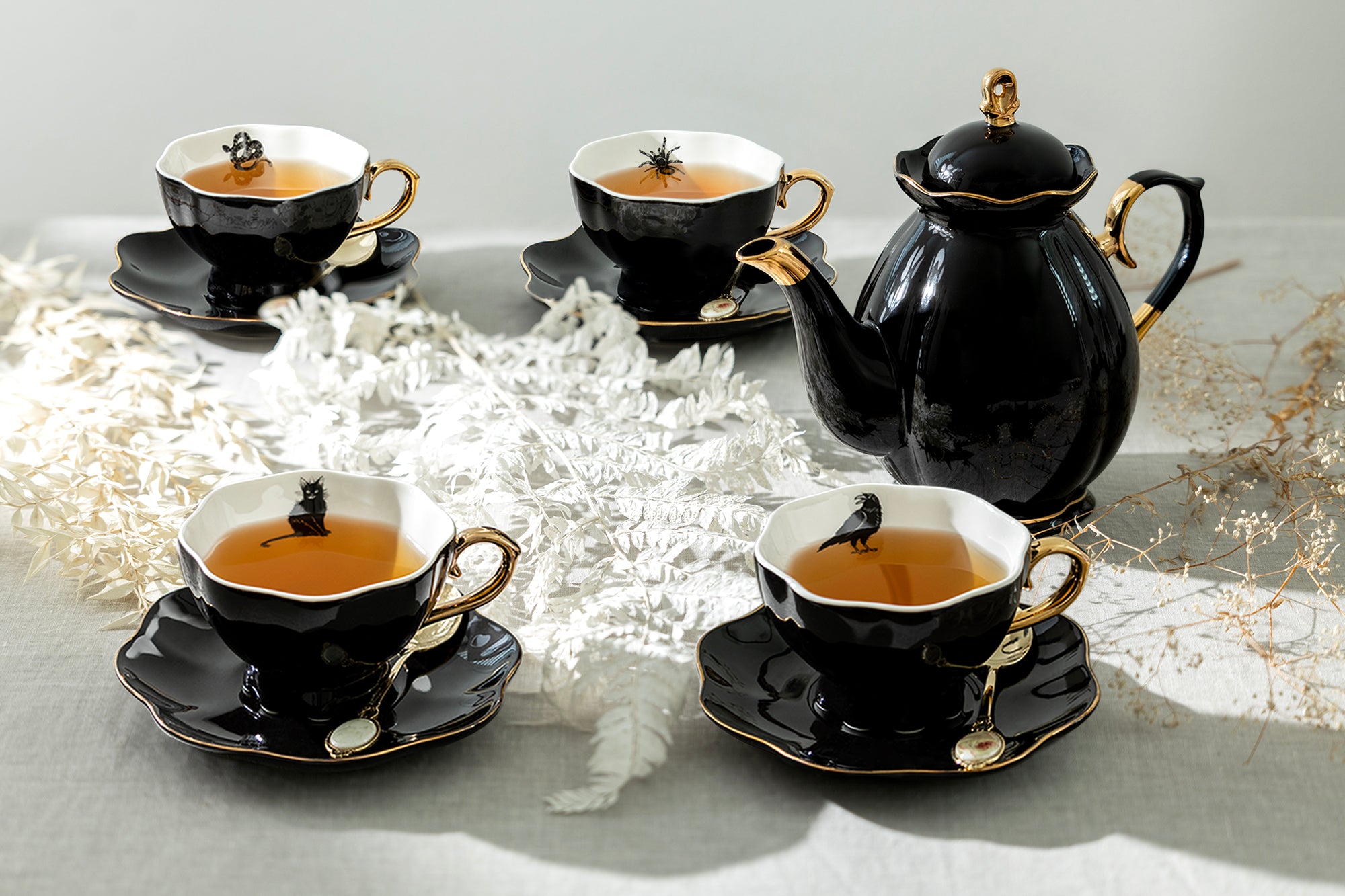 For this version, each set includes - 1 Black Gold Scallop Teapot with 4 Assorted Halloween Tea Cup and Saucer Sets (Cat, Raven, Snake, Spider - one of each). This tea set can be perfectly matched with Black Gold Scallop Fine Porcelain Sugar & Creamer Set. The sugar creamer set is available in Sugars & Creamers section.