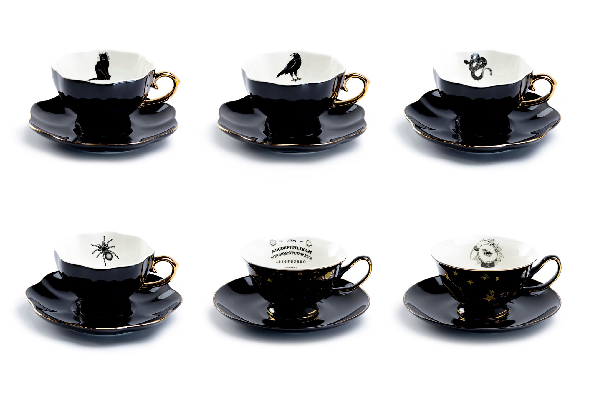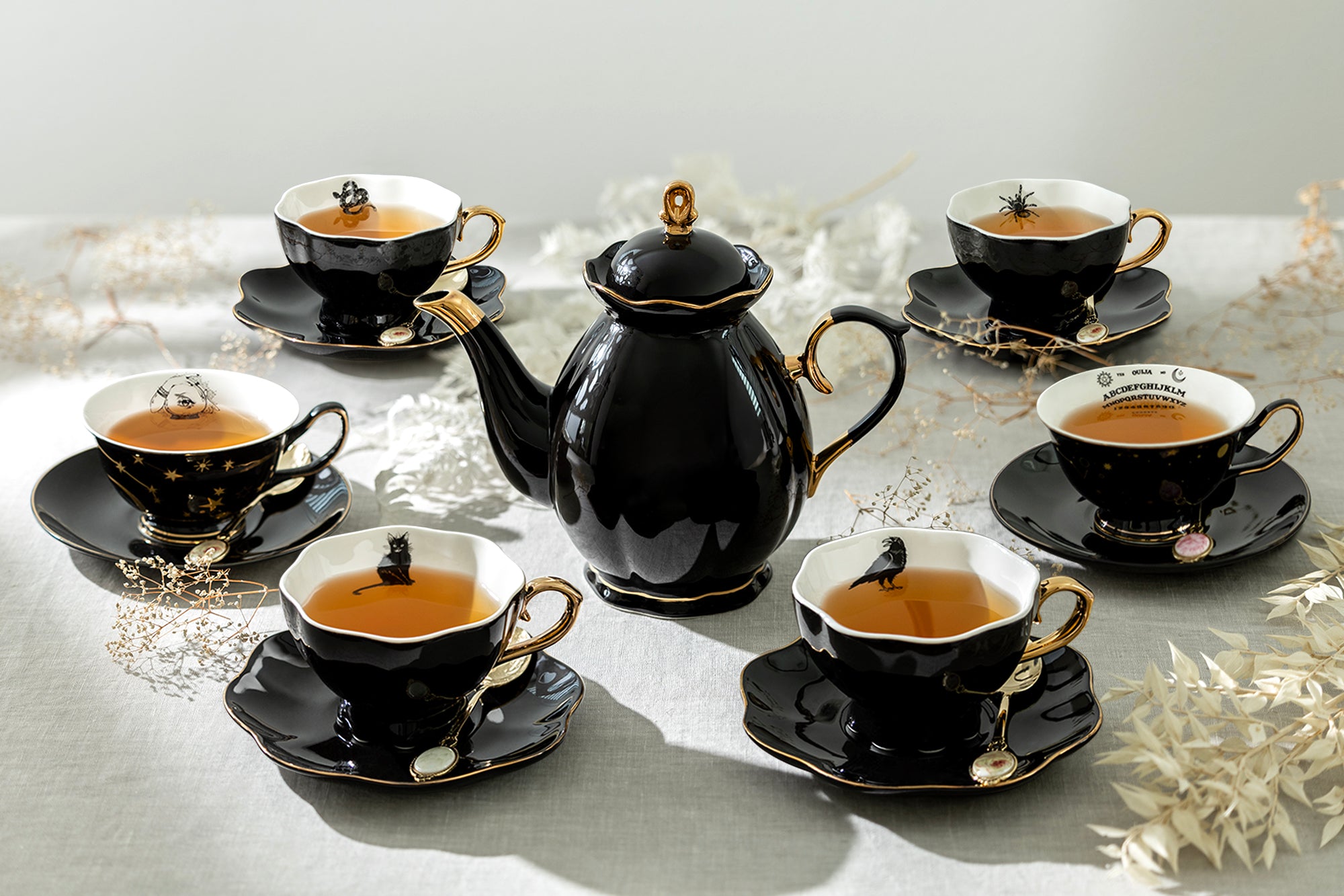 For this version, each set includes - 1 Black Gold Scallop Teapot with 6 Assorted Halloween Tea Cup and Saucer Sets (Cat, Raven, Snake, Spider, Ouija, Witchy Crystal Ball - one of each). This tea set can be perfectly matched with Black Gold Scallop Fine Porcelain Sugar & Creamer Set. The sugar creamer set is available in Sugars & Creamers section.