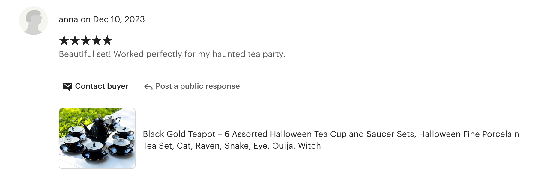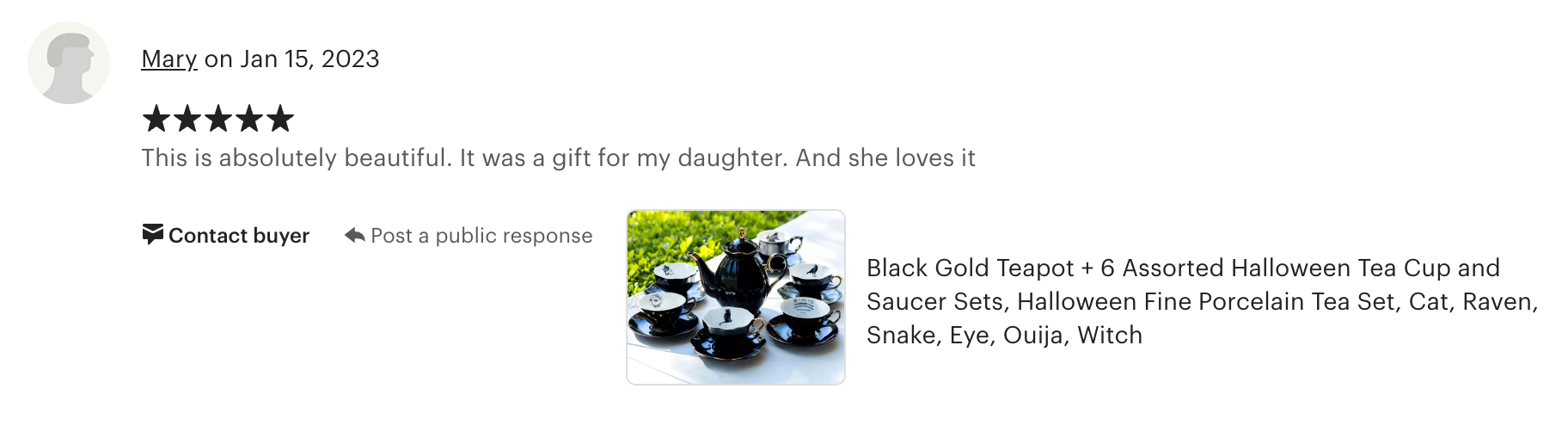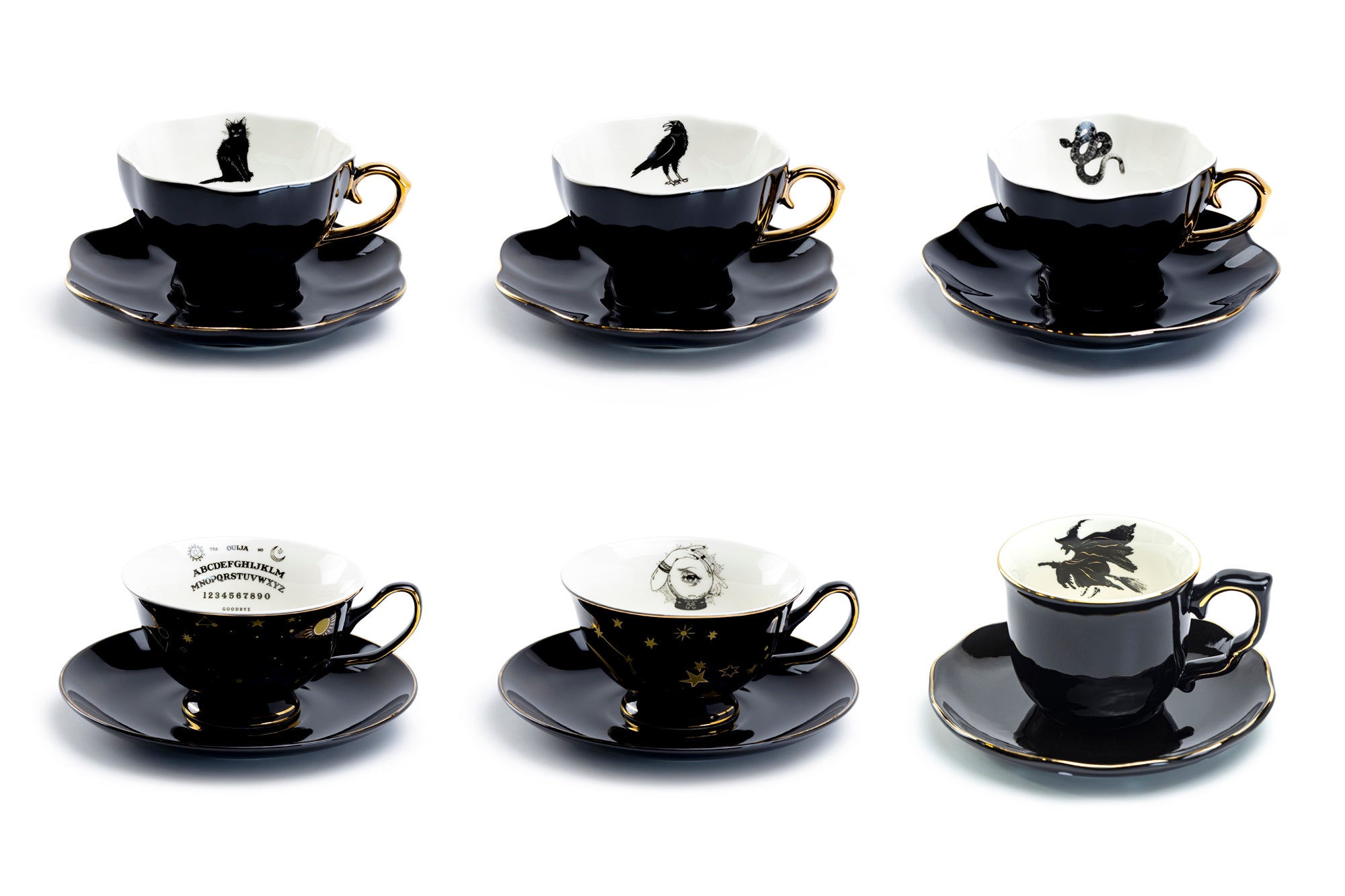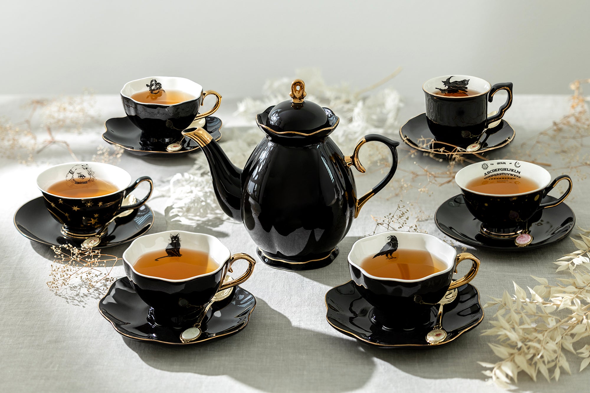 For this version, each set includes - 1 Black Gold Scallop Teapot with 6 Assorted Halloween Tea Cup and Saucer Sets (Cat, Raven, Snake, Ouija, Witchy Crystal Ball, Flying Witch - one of each). This tea set can be perfectly matched with Black Gold Scallop Fine Porcelain Sugar & Creamer Set. The sugar creamer set is available in Sugars & Creamers section.