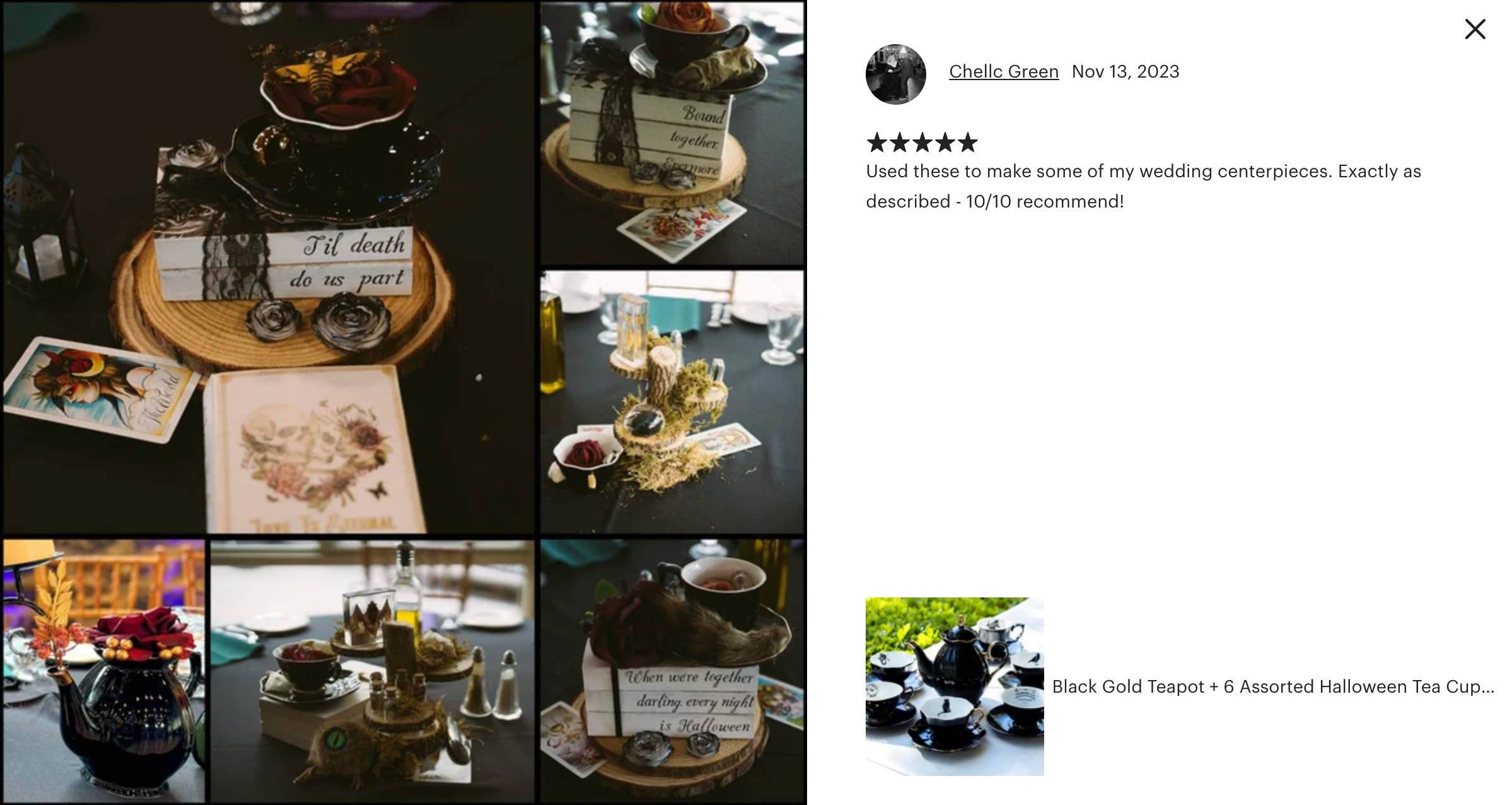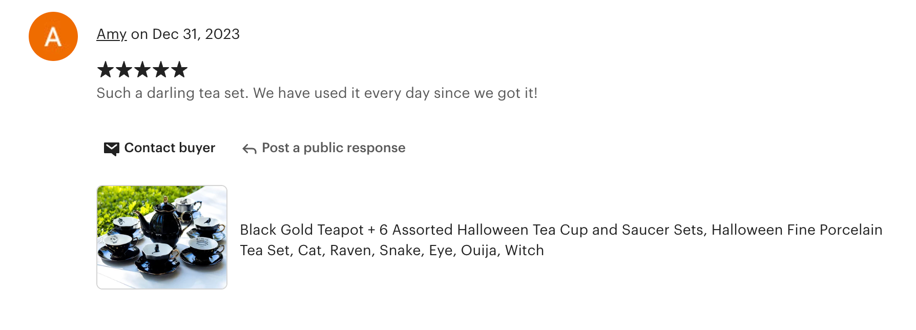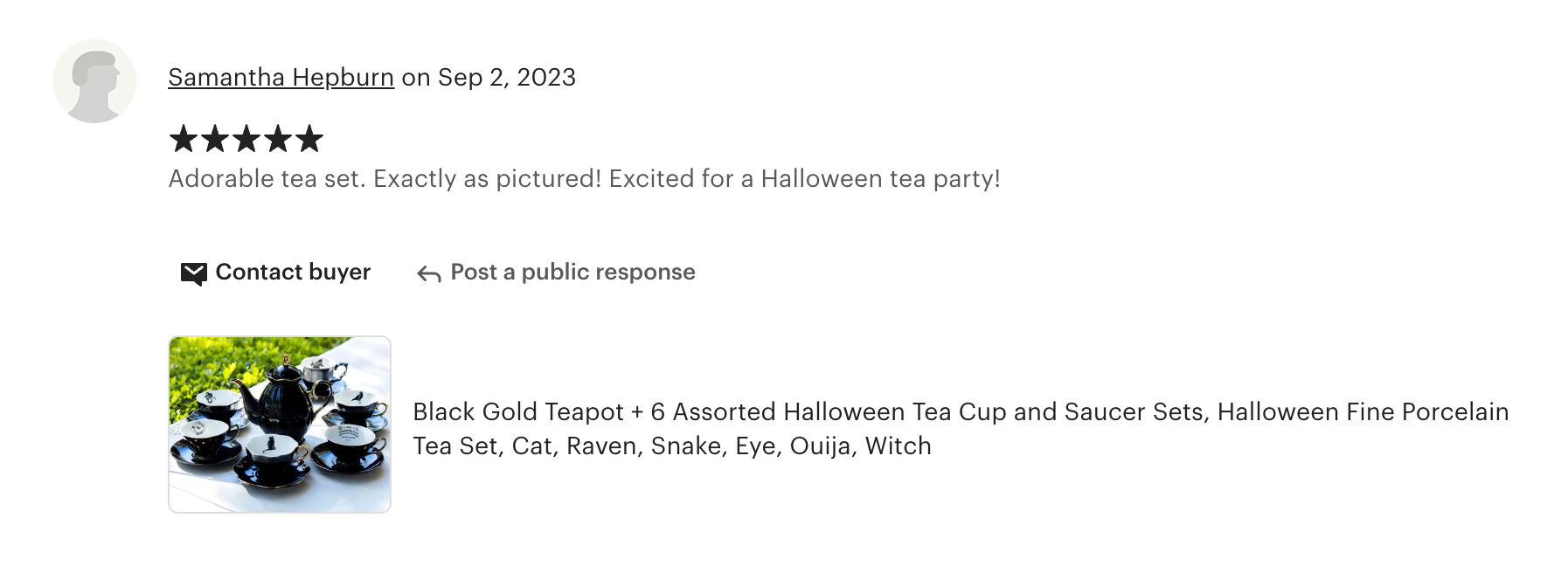 For this version, each set includes - 1 Black Gold Scallop Teapot with 6 Assorted Halloween Tea Cup and Saucer Sets (Cat, Raven, Snake, Ouija, Witchy Crystal Ball, Flying Witch - one of each). This tea set can be perfectly matched with Black Gold Scallop Fine Porcelain Sugar & Creamer Set. The sugar creamer set is available in Sugars & Creamers section.