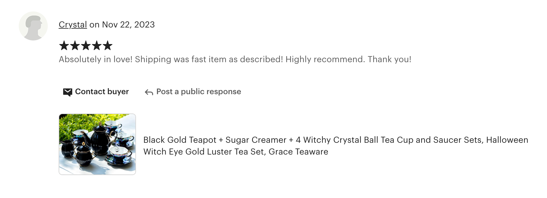 • Black Gold Teapot + Sugar Creamer + 4 Witchy Crystal Ball Black Gold Luster Tea Cup and Saucer Sets