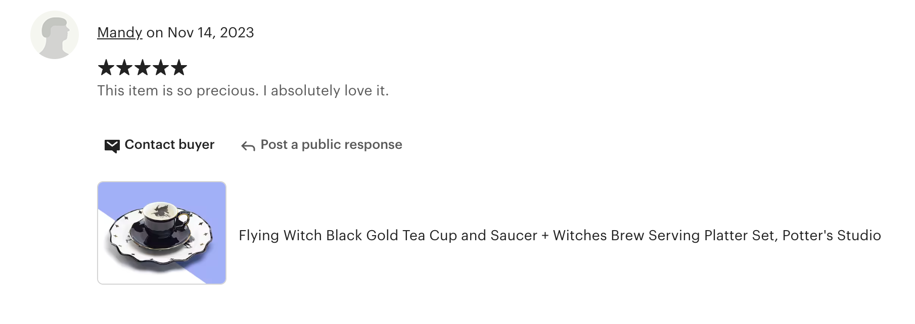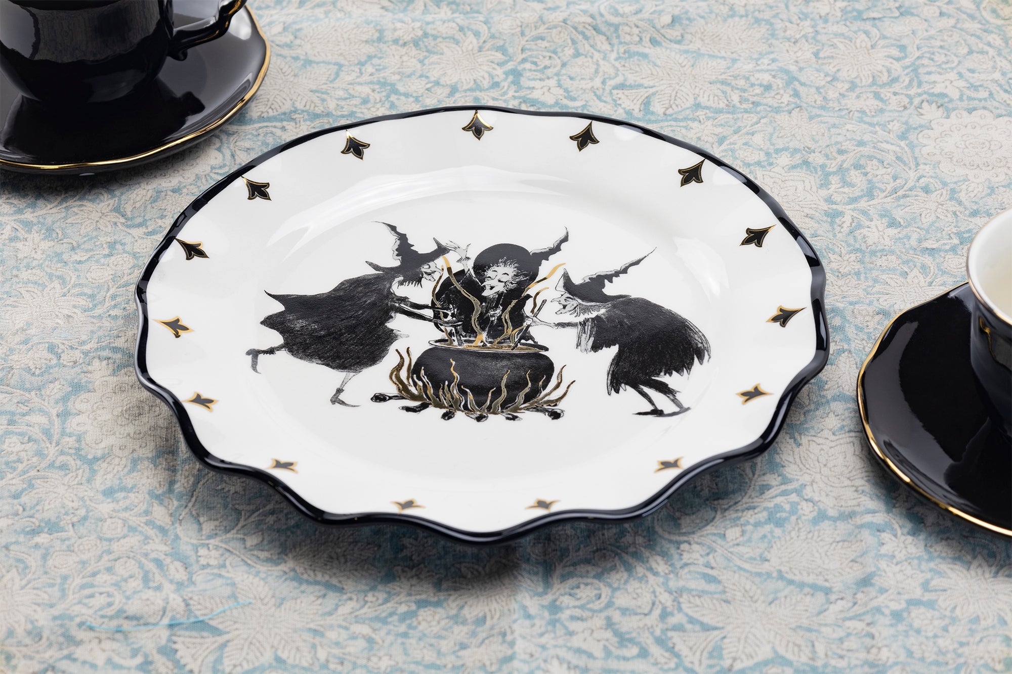 • Flying Witch Black Gold Tea Cup and Saucer + Witches Brew Serving Platter Set