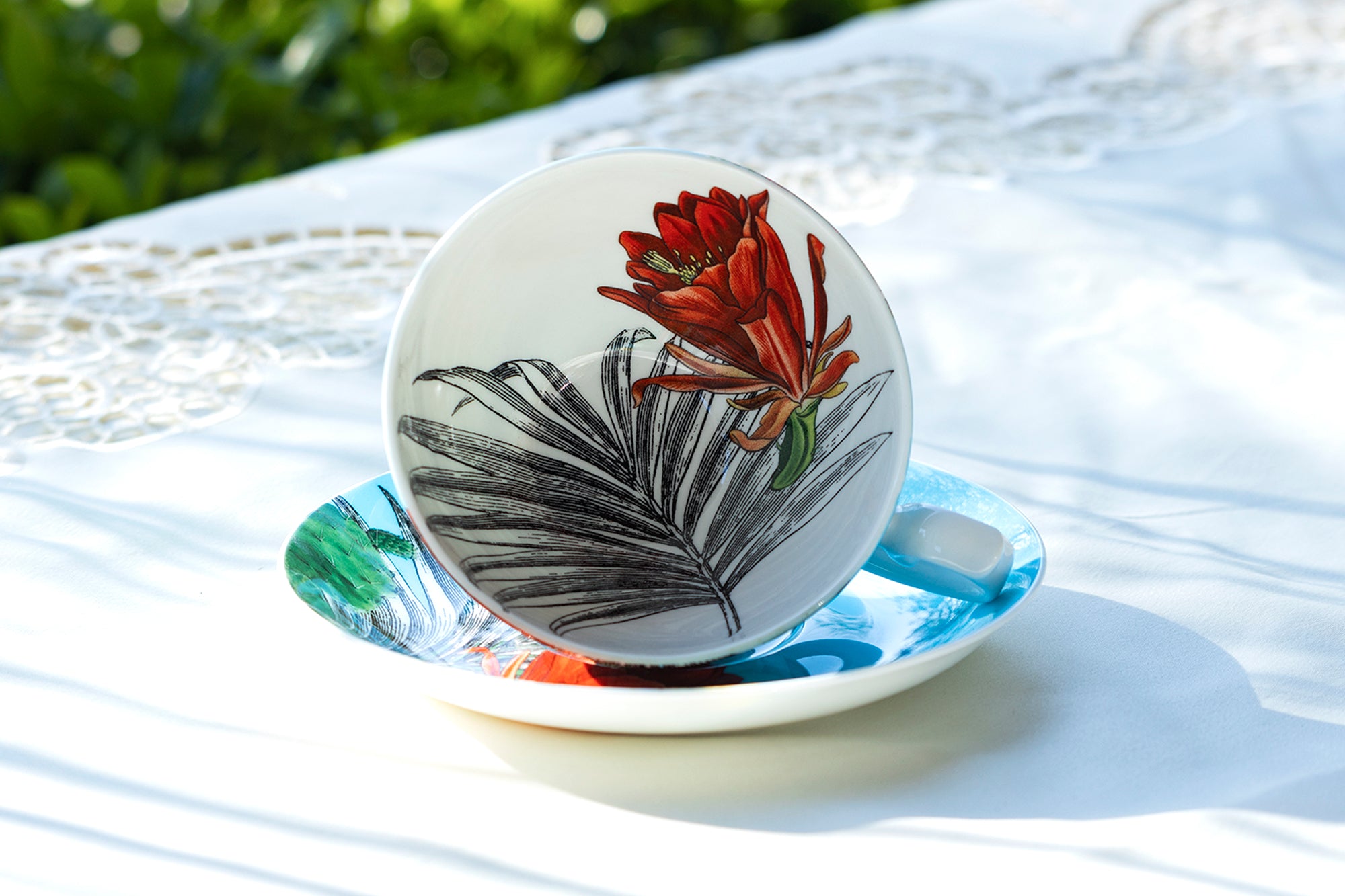 • Cactus Flower and Palm Leaf Bone China Tea Cup and Saucer