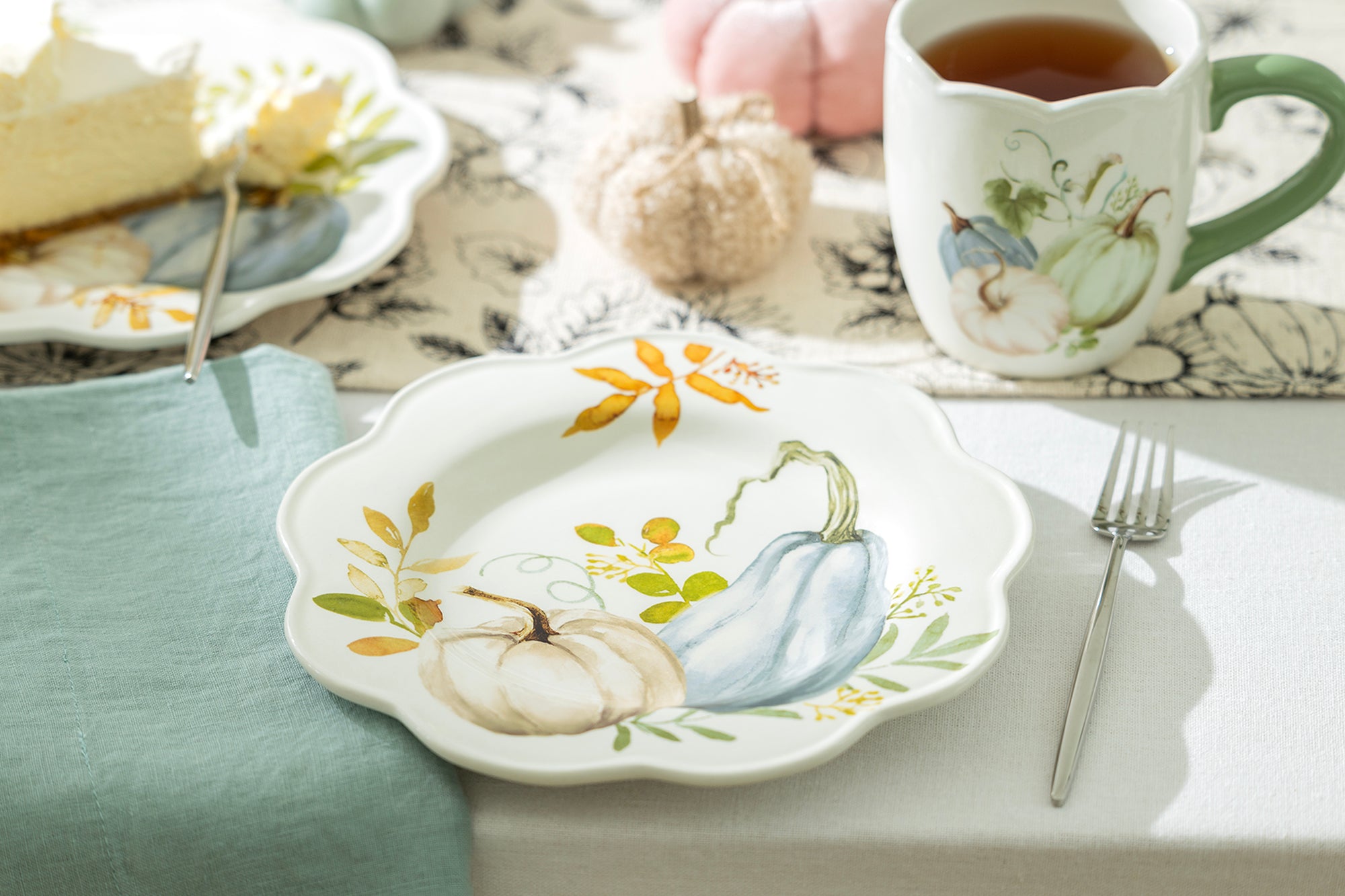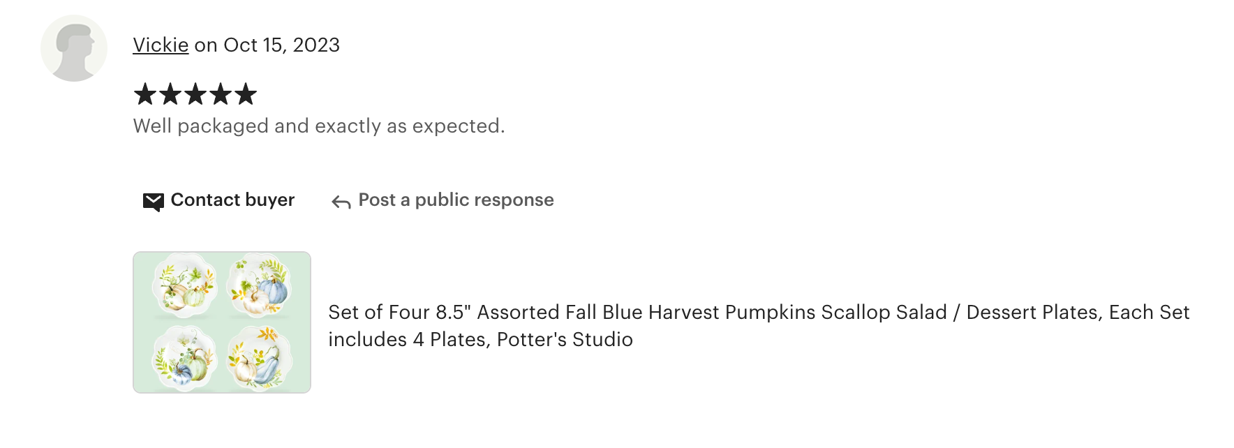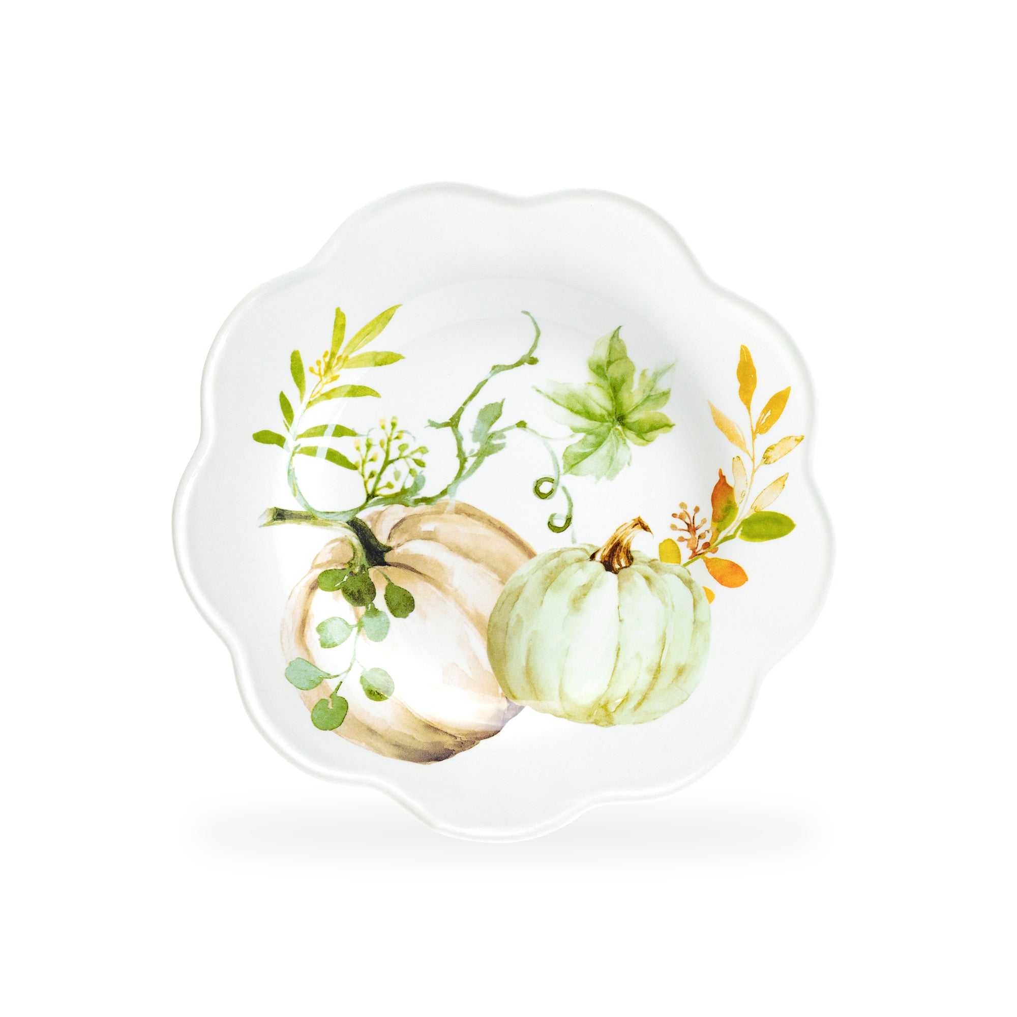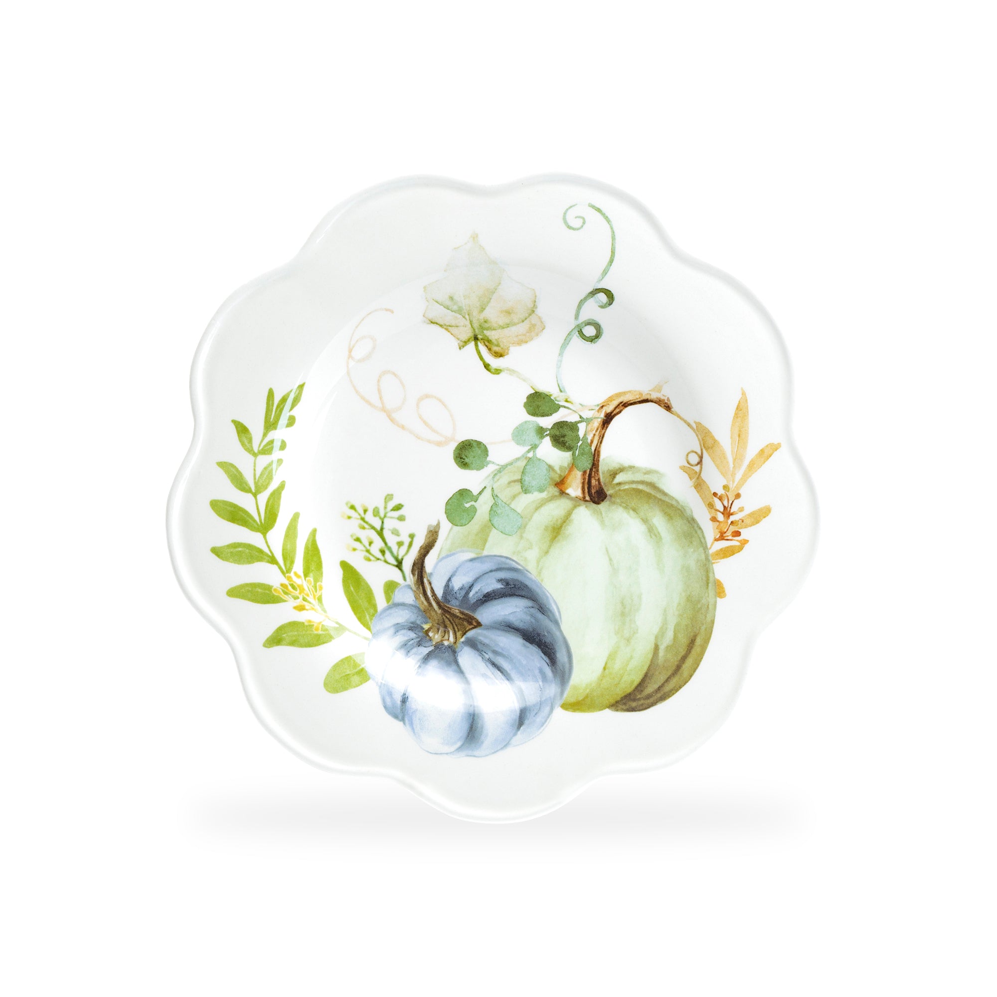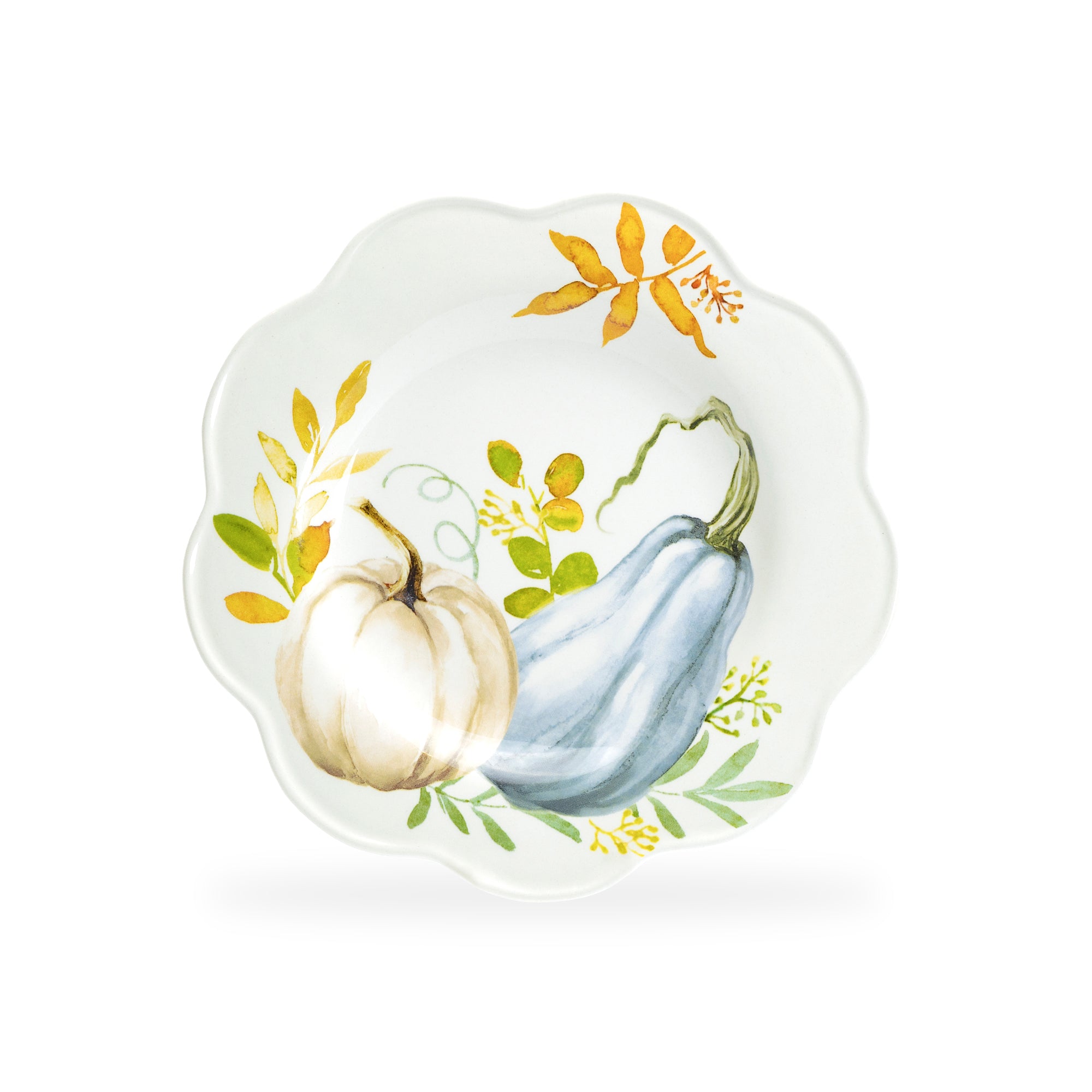 Each set includes - four 8.5" salad / dessert plates, in 4 different pumpkin patterns. This product is handcrafted and you may notice small air bubbles or pinholes on its surface. This is normal and to be expected as a result of the intricate ceramic manufacturing process.