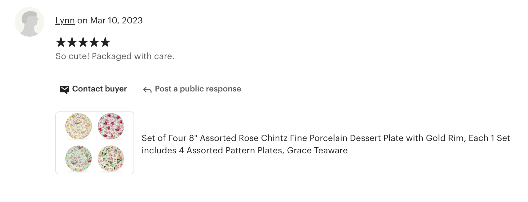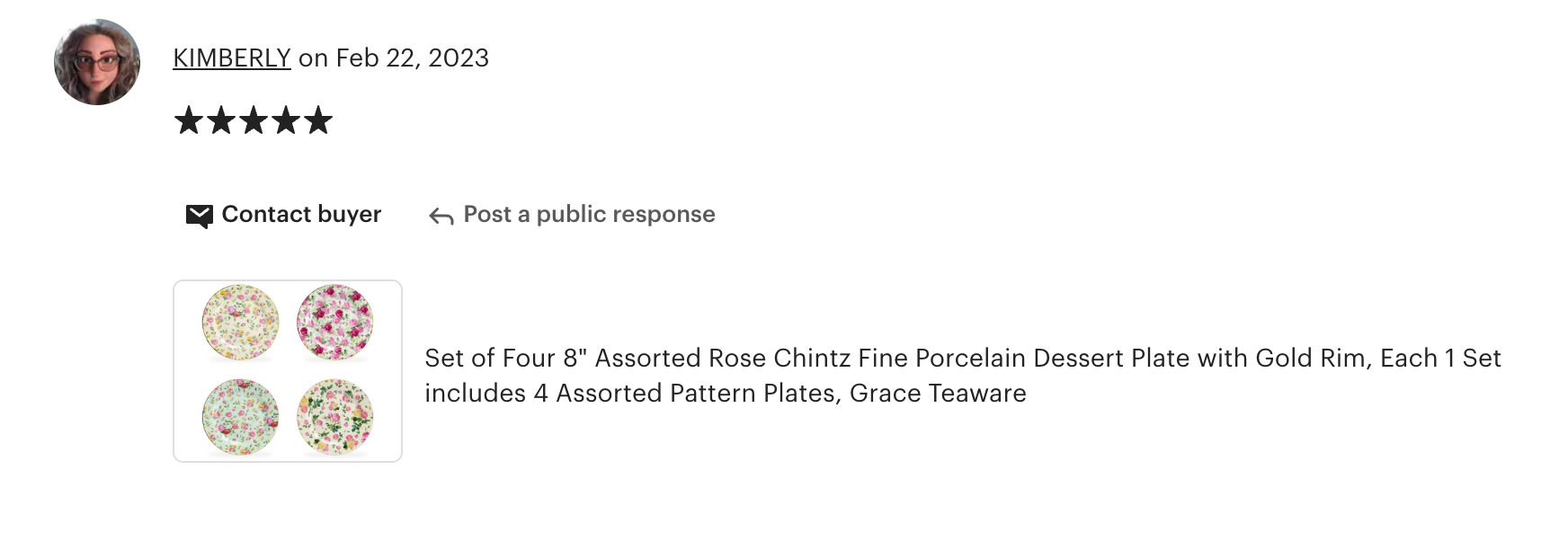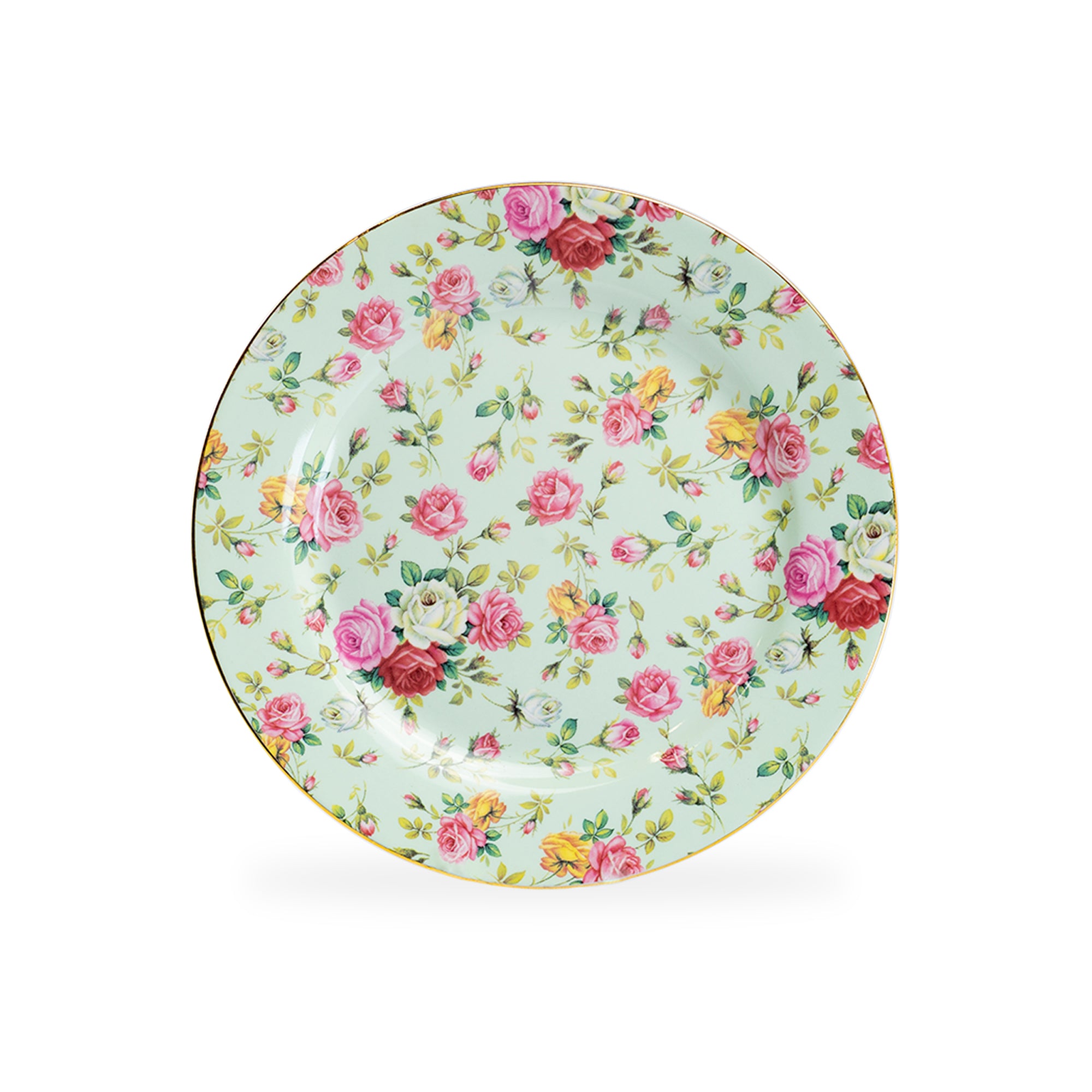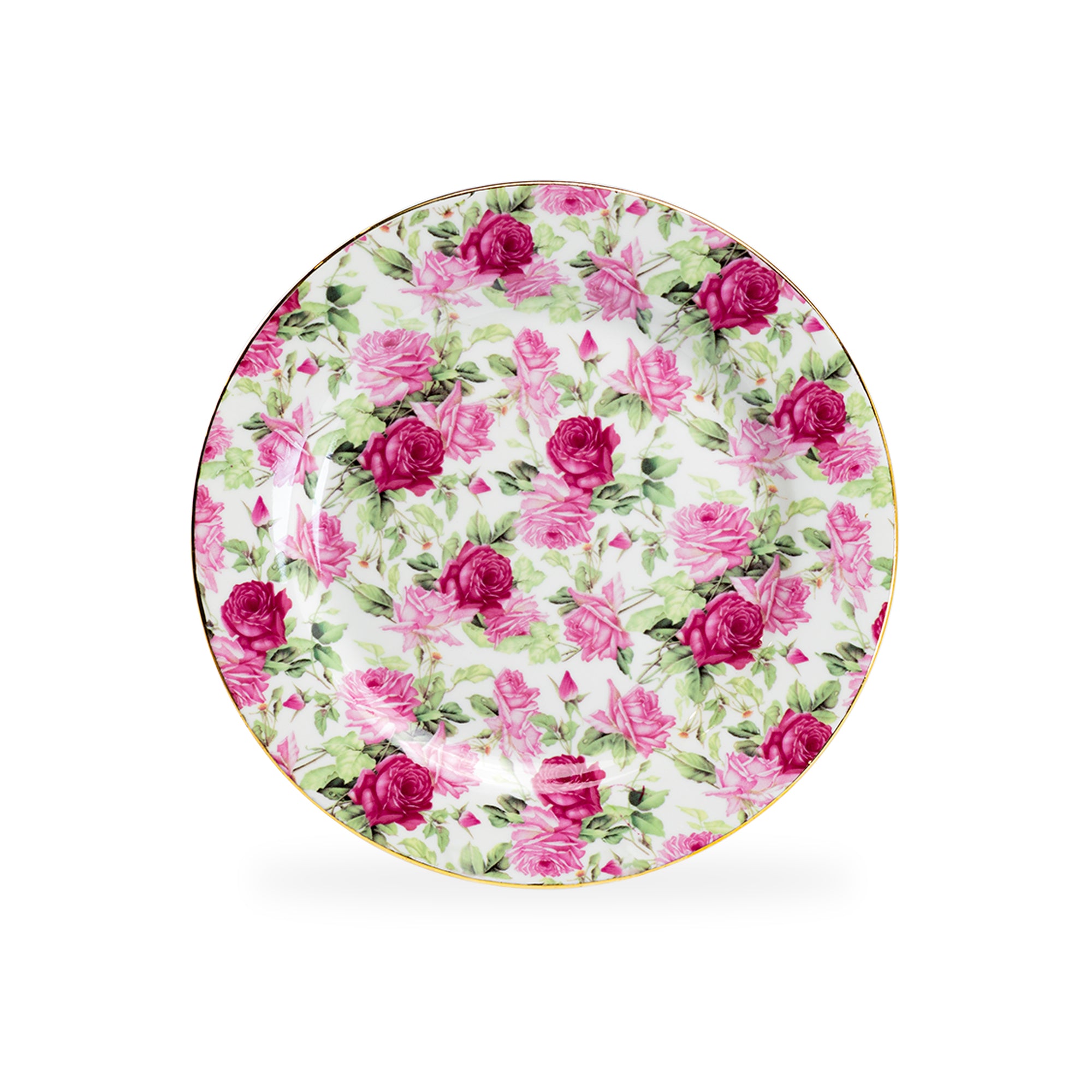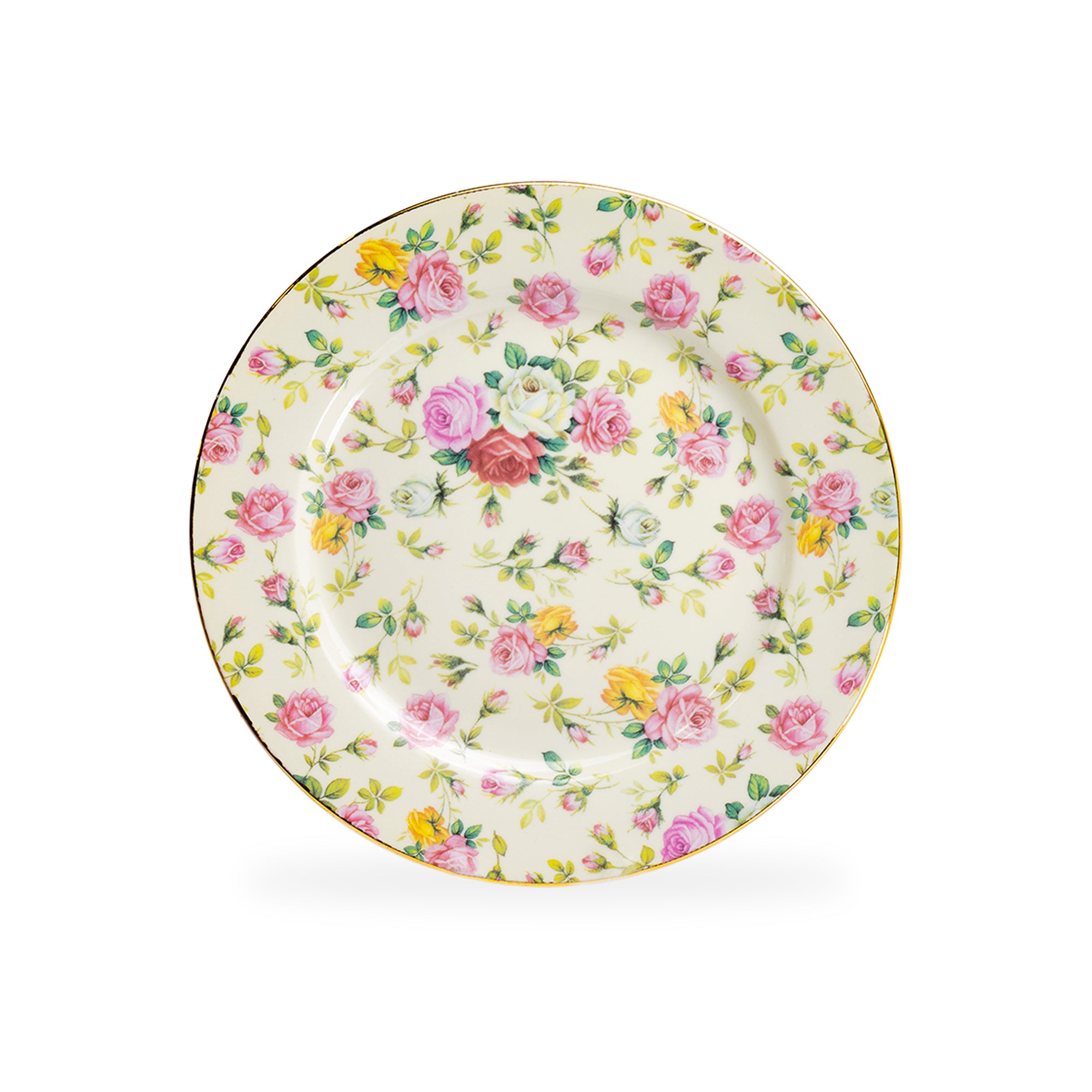 Each set includes - 4 assorted rose chintz patterns dessert plates