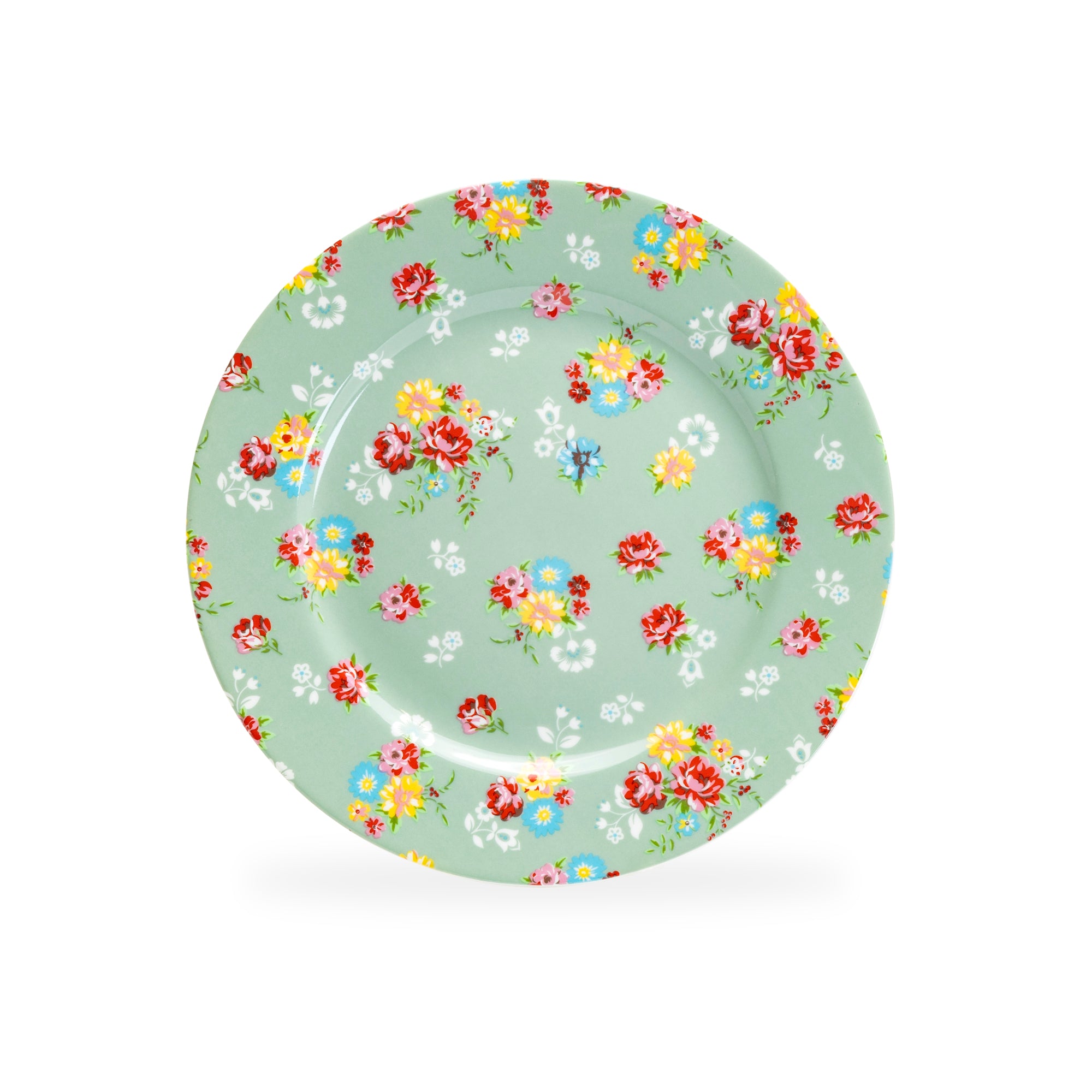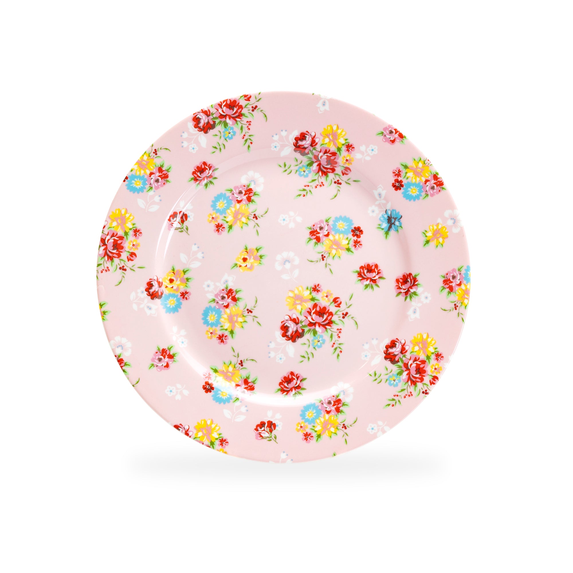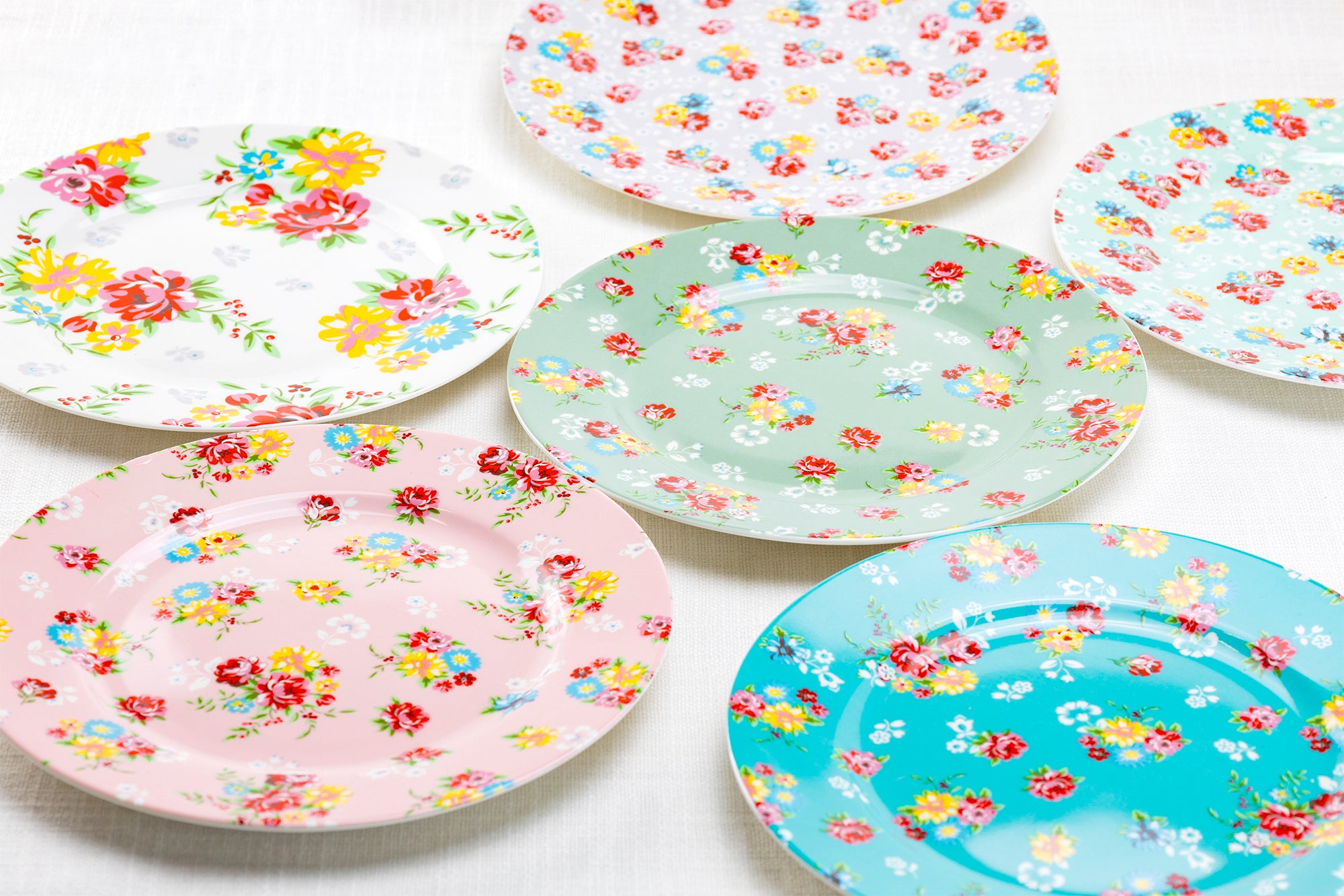 Each set includes - 6 assorted shabby rose pattern dessert plates