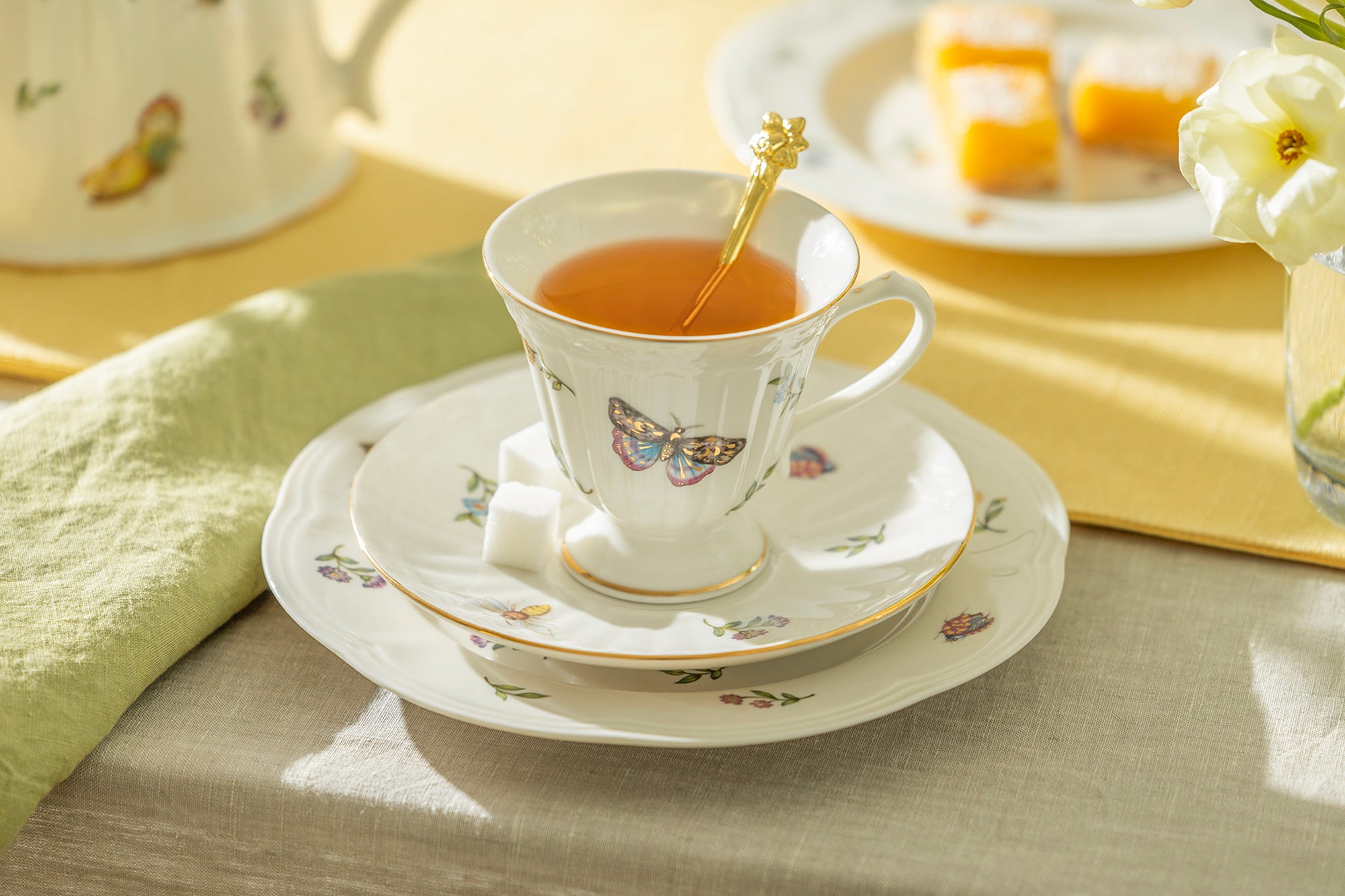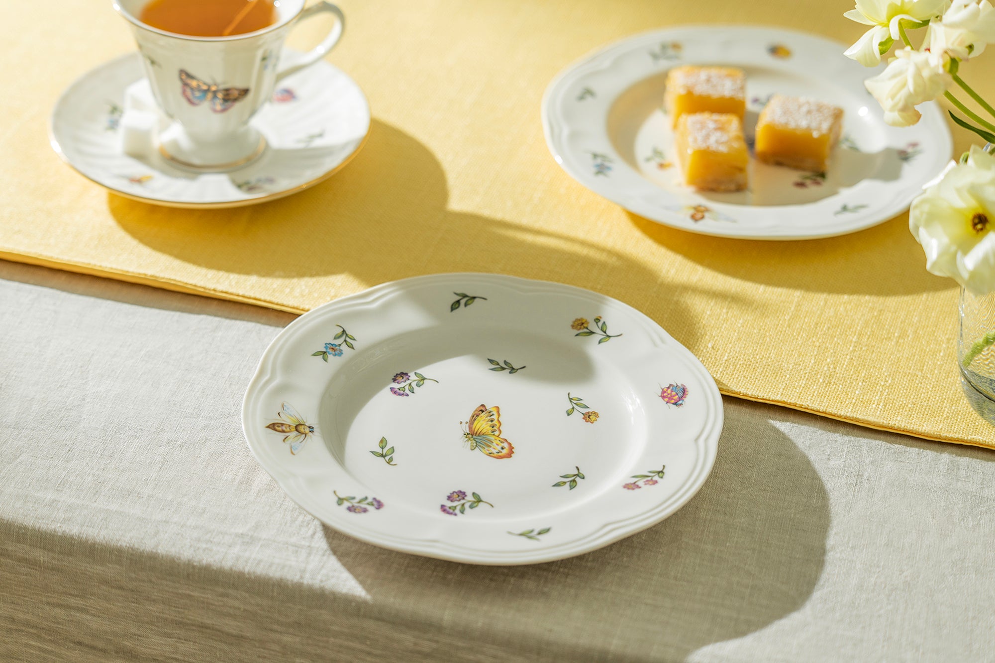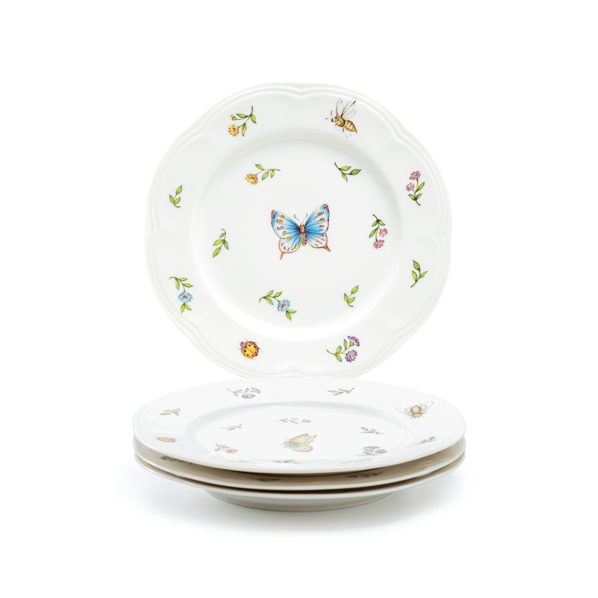 This plate set features a variety of Summer Garden themed decals, including petite flowers, green dragonflies, yellow dragonflies, yellow butterflies, blue butterflies, bees, and beetles. As a result, each set has a unique combination of decal patterns, making it possible that the appearance of the plates may not match the listing images precisely.
