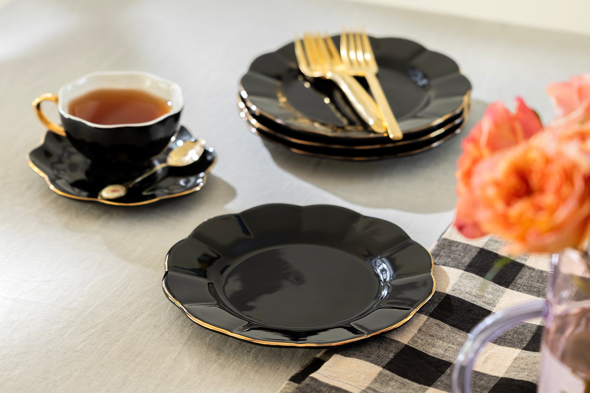 This product may exhibit minor gold imperfections and scratches, a result of its glossy black glaze and highly reflective surface paired with hand-applied gold trim, lending each piece a distinct, unique character. Please be aware that scratches are more visible on darker, glossy finishes like this one compared to lighter colors or decaled designs.