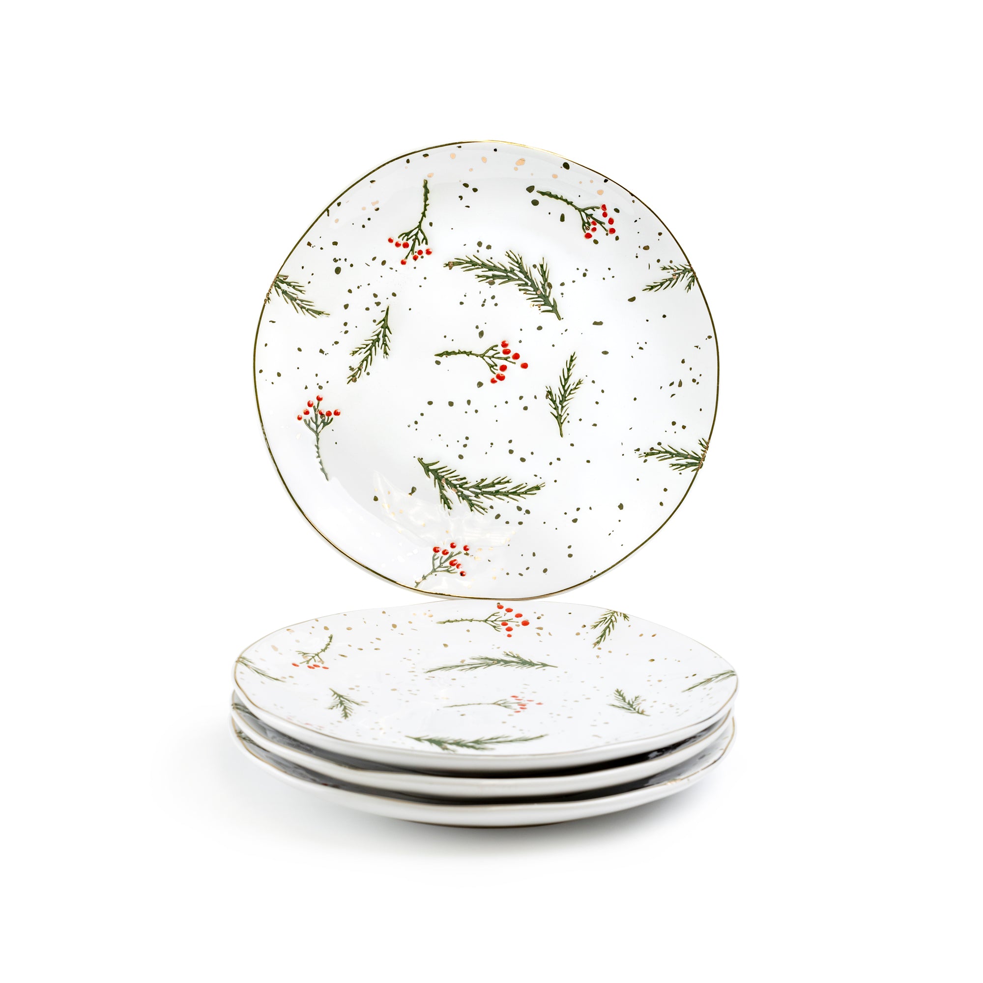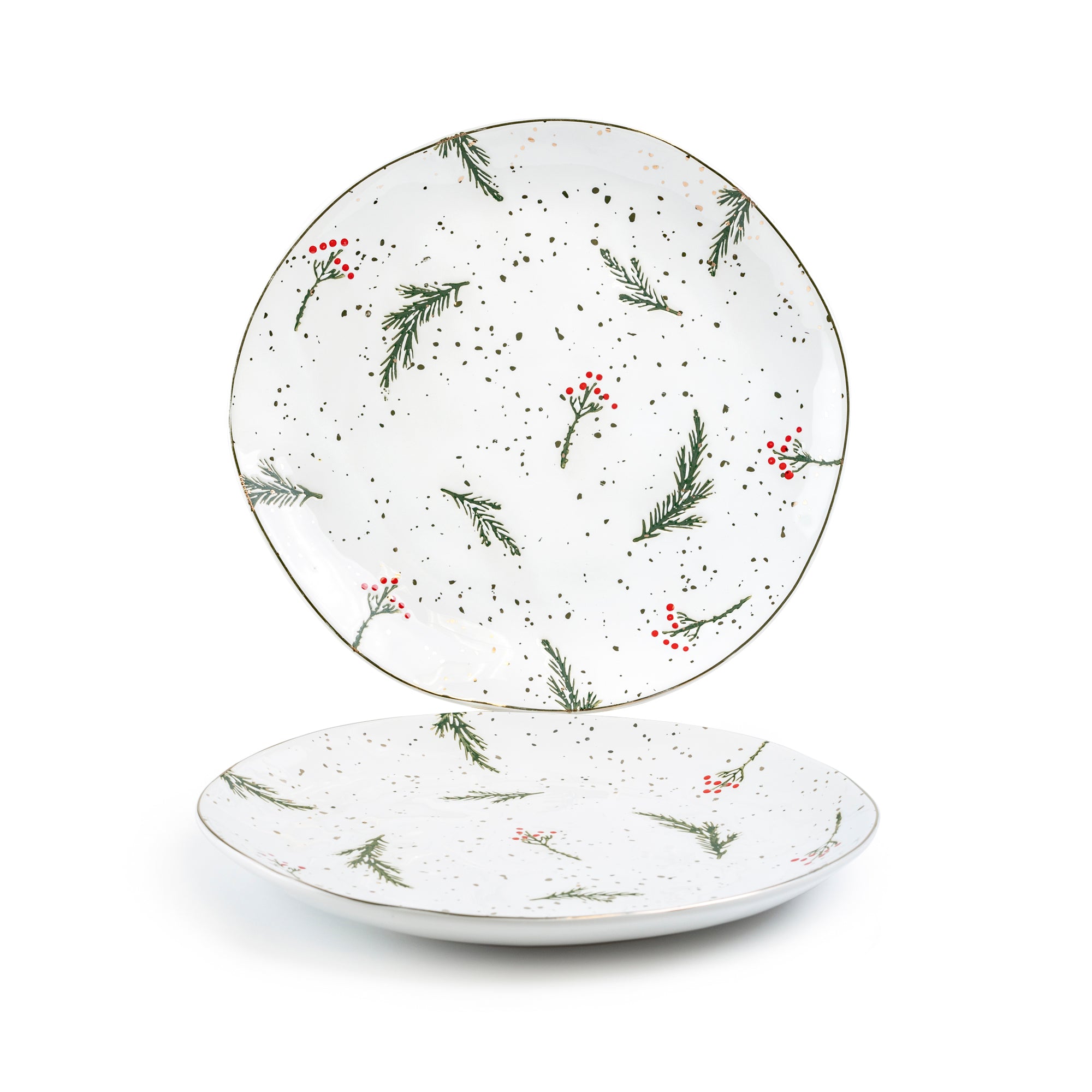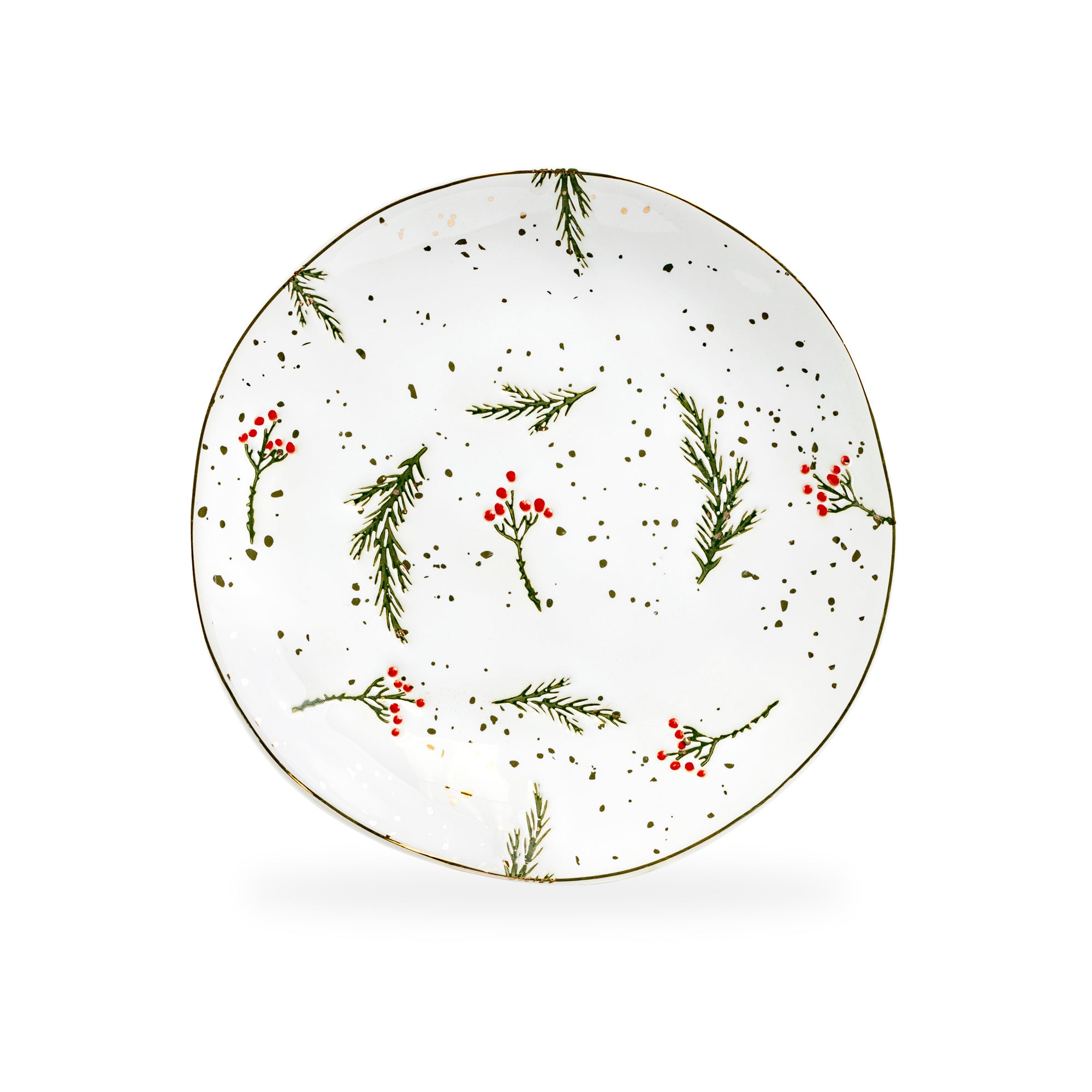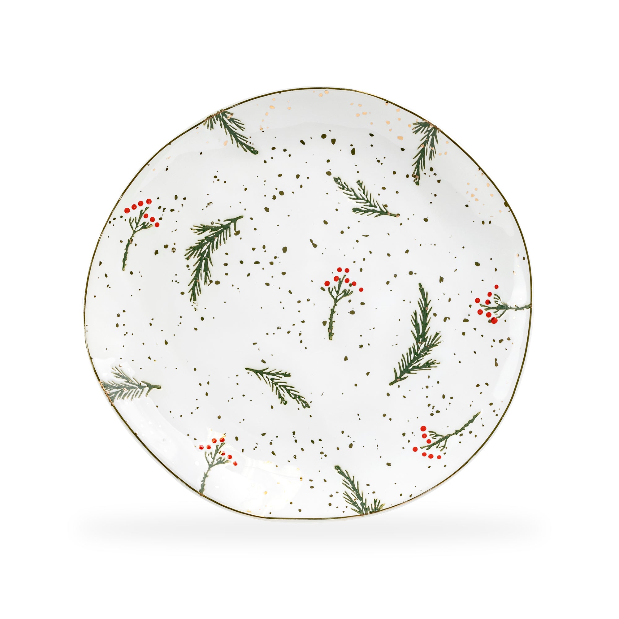 The Holly Berries Organic Shape Dessert/Dinner Plate features intricately engraved patterns of holly berries and evergreen sprigs, adding a tactile element to its festive design. Scattered gold specks complement the engraved details, creating a subtle sparkle that enhances its seasonal charm. The organic shape of the plate adds an artisanal touch, making it ideal for both everyday use and special holiday gatherings.